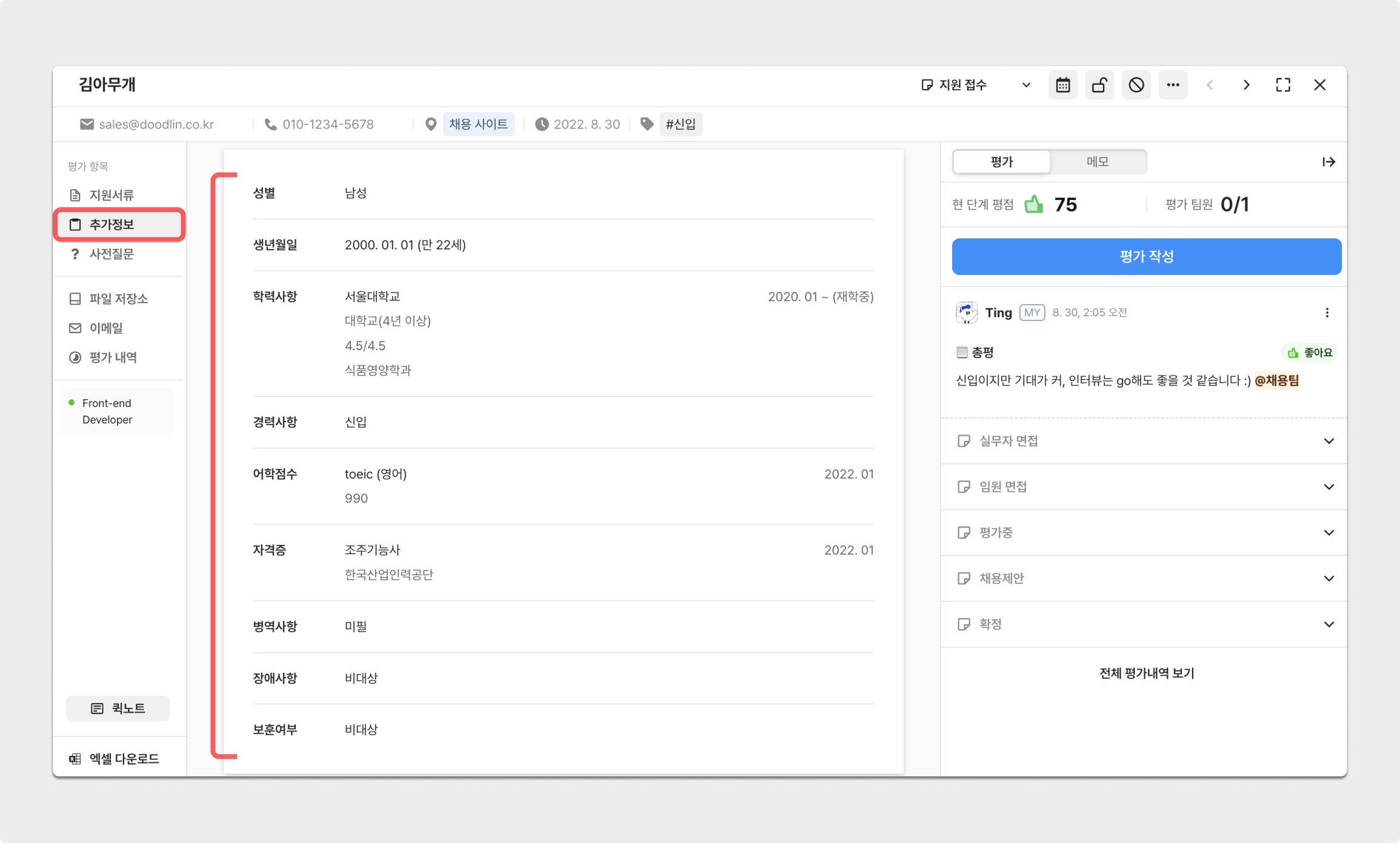 지원자 상세 페이지 내 추가정보