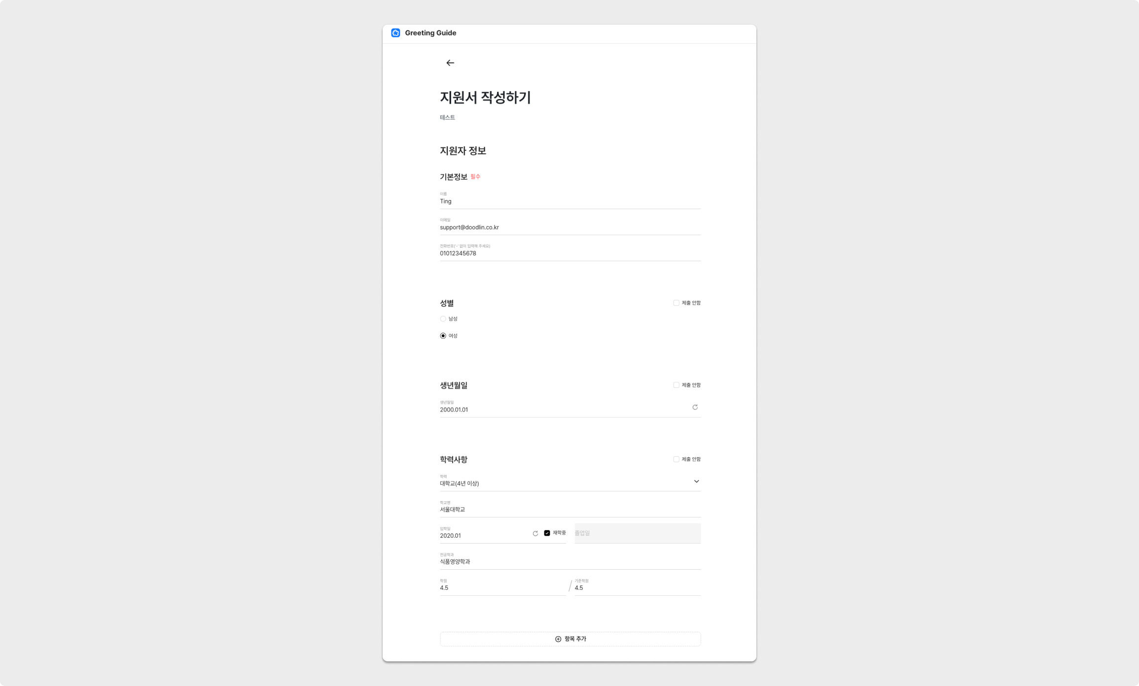 지원자 추가 정보 기능을 적용한 지원서 작성 페이지의 예시는 아래 이미지와 같습니다. (지원자 view)