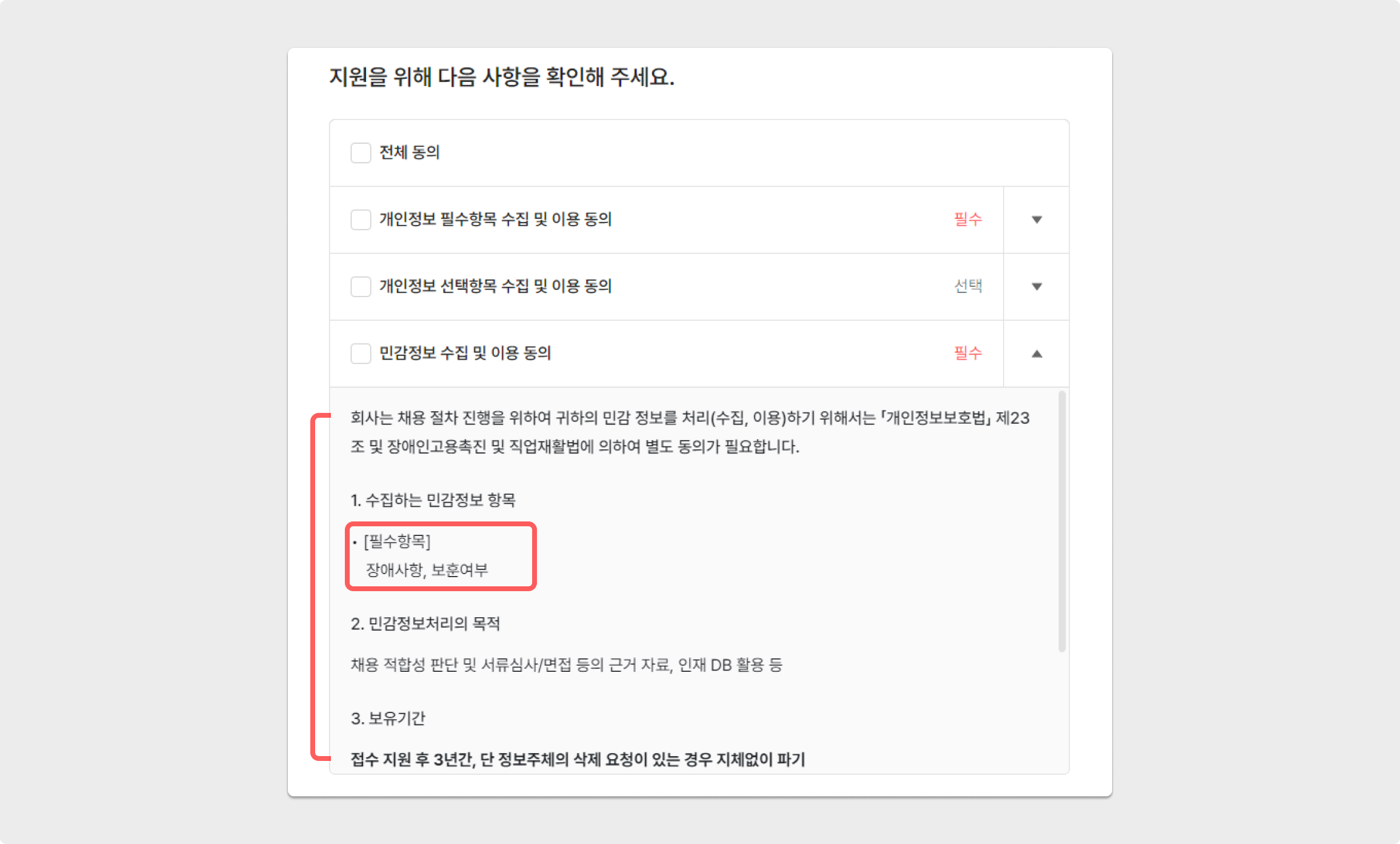 장애사항과 보훈여부를 제출받도록 설정한다면, 지원자의 지원 과정 중 민감정보 수집 및 이용에 대한 동의 여부를 받게 됩니다.