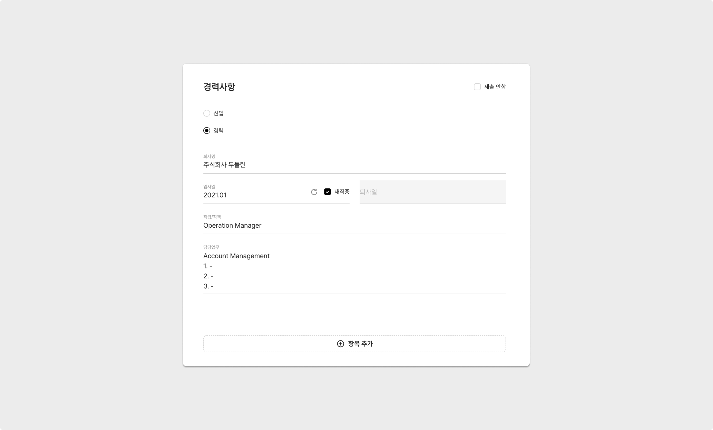지원자의 경력사항을 입력할 수 있는 항목이며, 신입/경력 여부와 재직 여부를 선택할 수도 있습니다.