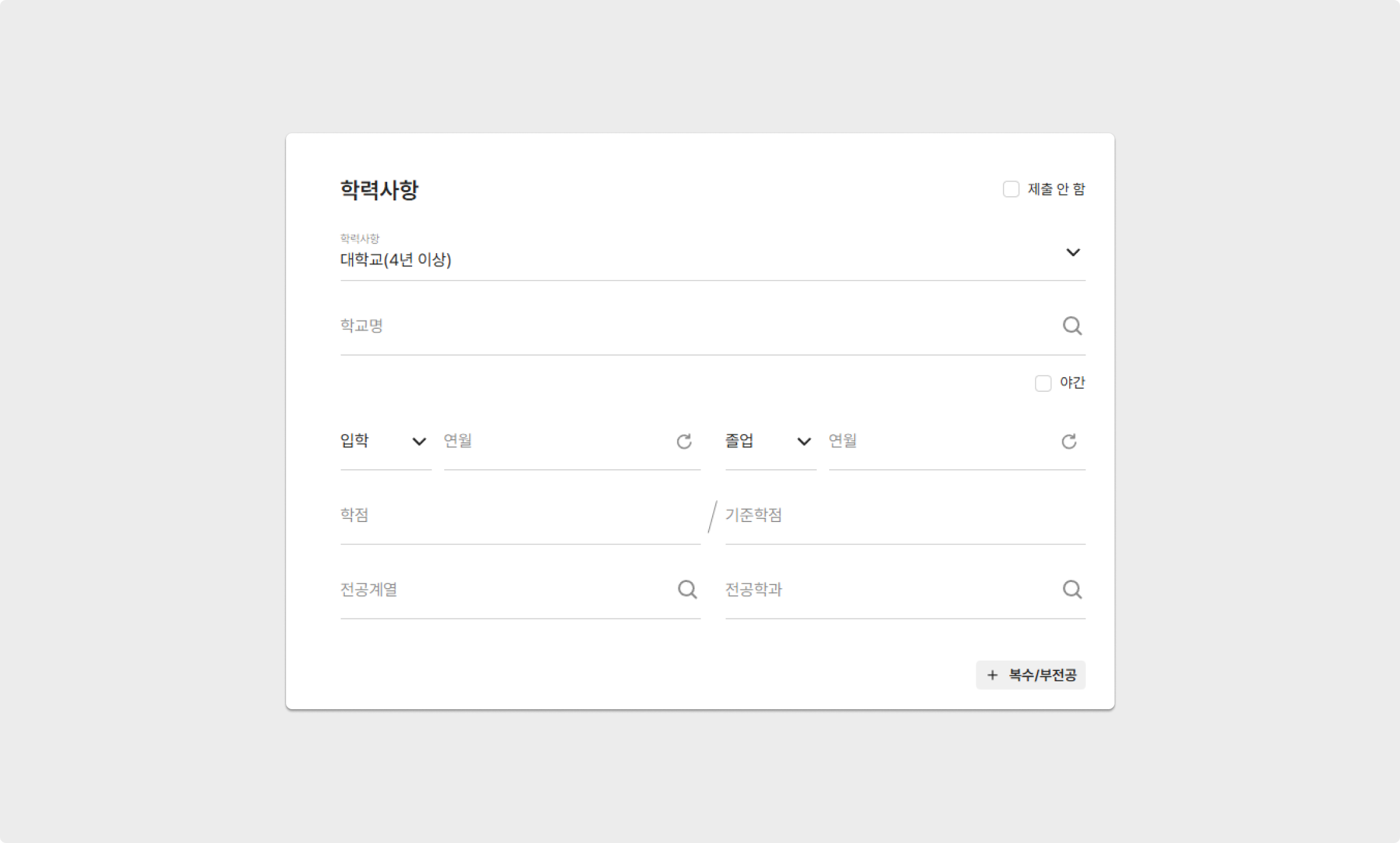 지원자가 본인의 학력사항을 입력할 수 있으며, + 항목 추가 버튼을 통해 추가 내용의 기입이 가능합니다.