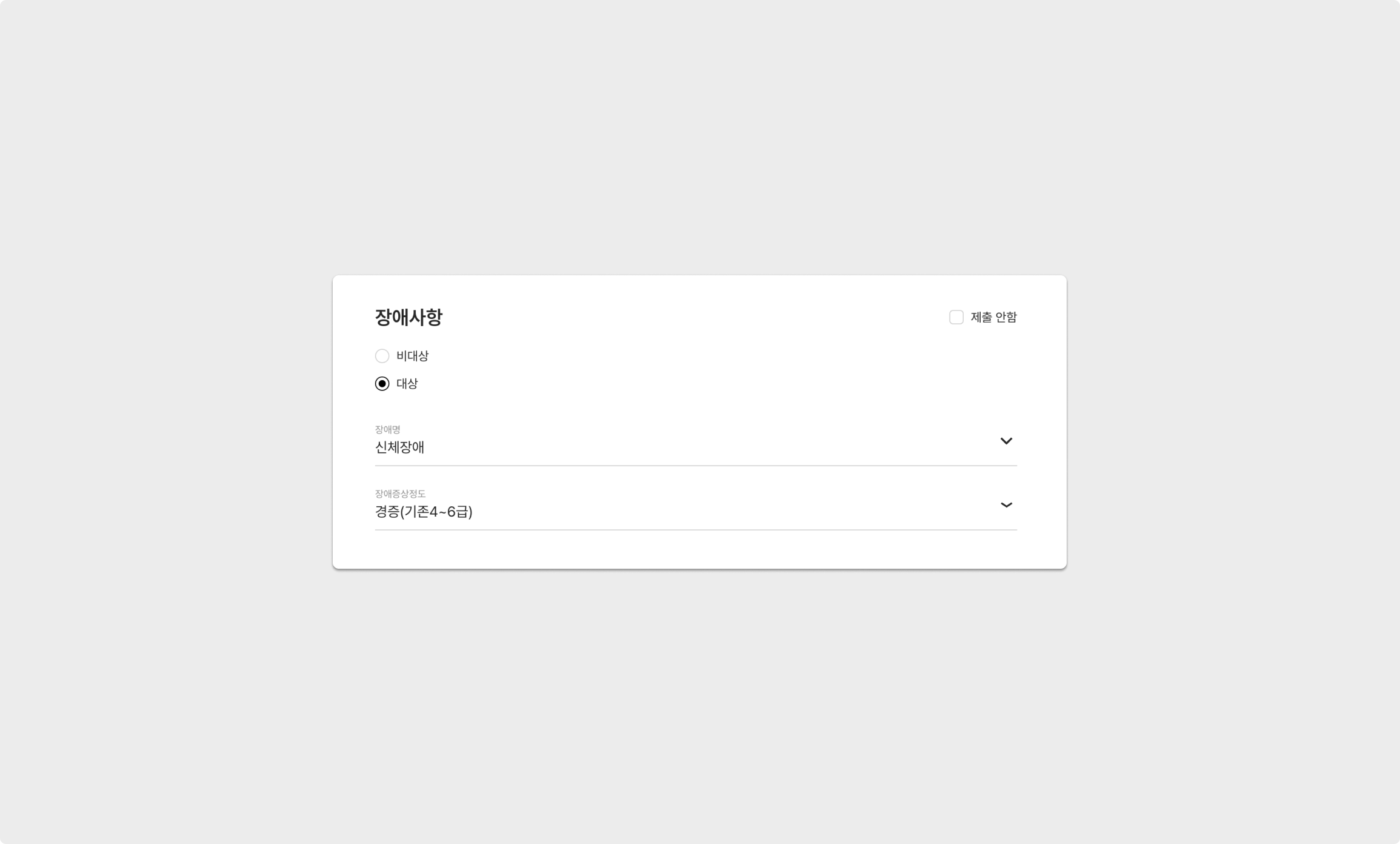 지원자의 장애사항을 입력할 수 있는 항목이며, 그 종류와 증상 정도를 선택할 수 있습니다.