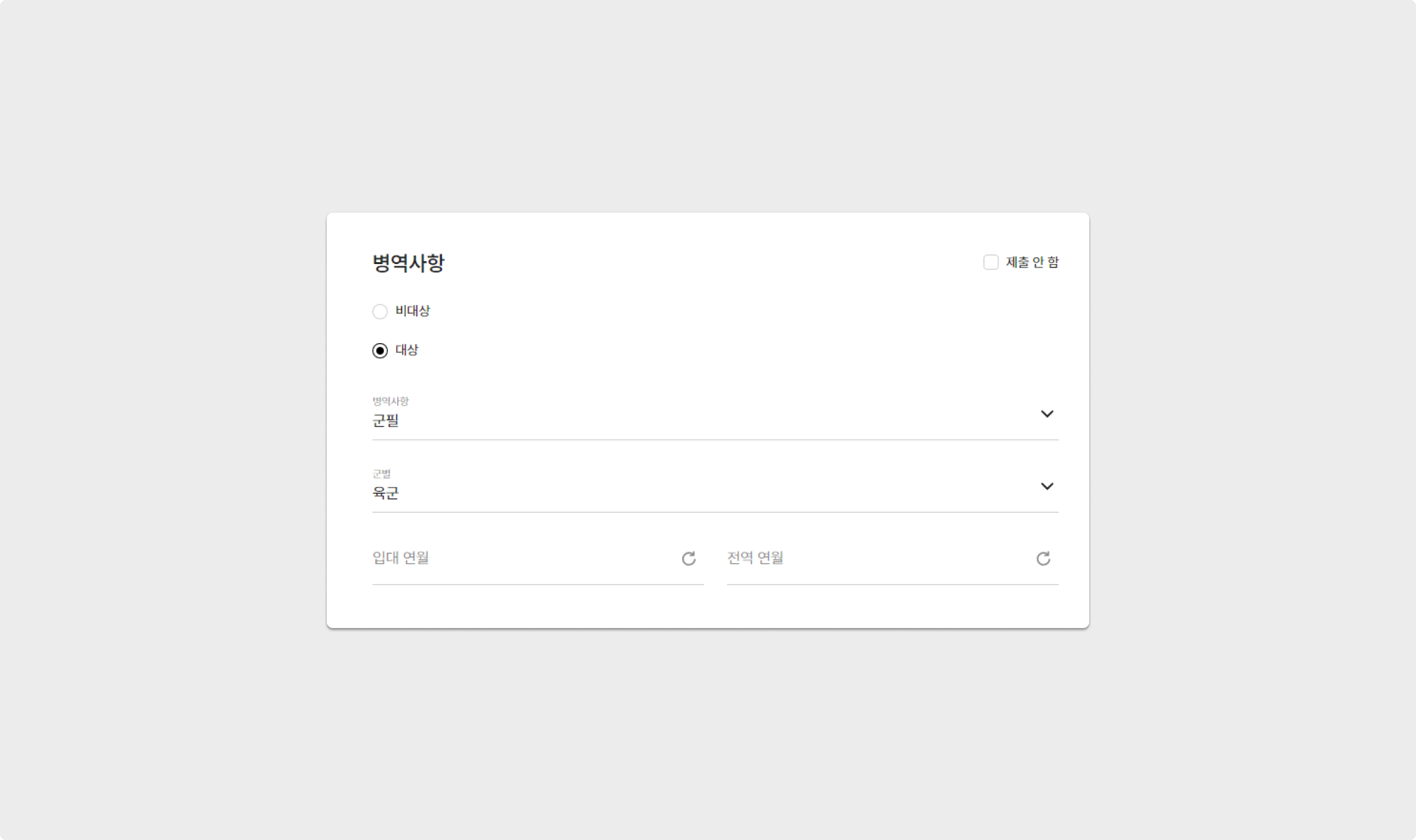 지원자는 병역사항을 비대상/대상 중 선택할 수 있으며, 대상의 경우 복무 기간 및 형태를 함께 선택하게 됩니다.