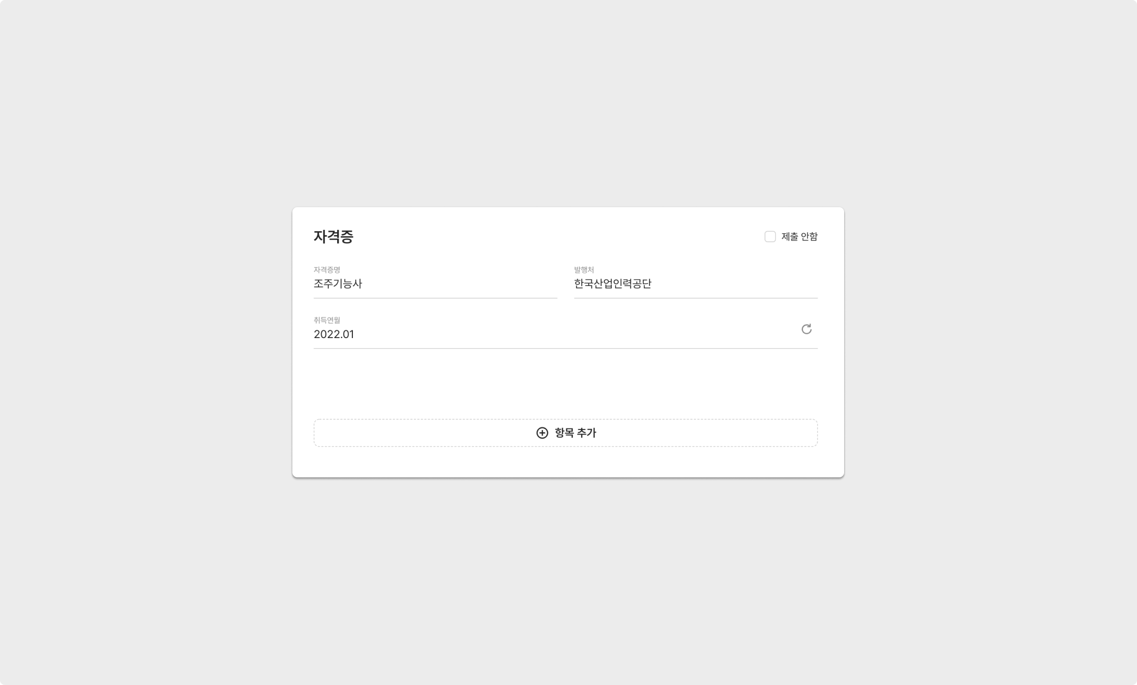 지원자가 취득한 자격증을 기재할 수 있는 항목이며, [+ 항목 추가]를 통해 추가로 입력할 수 있습니다.