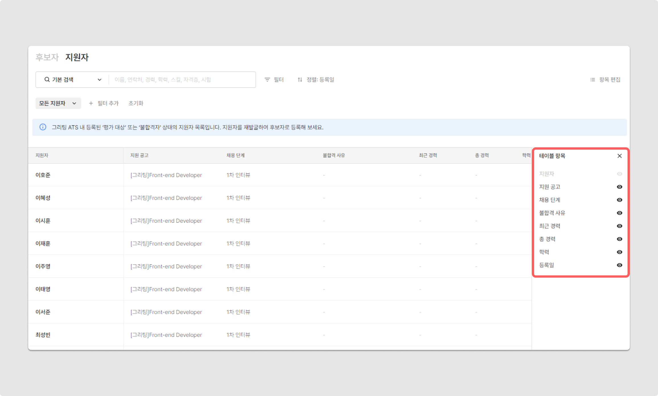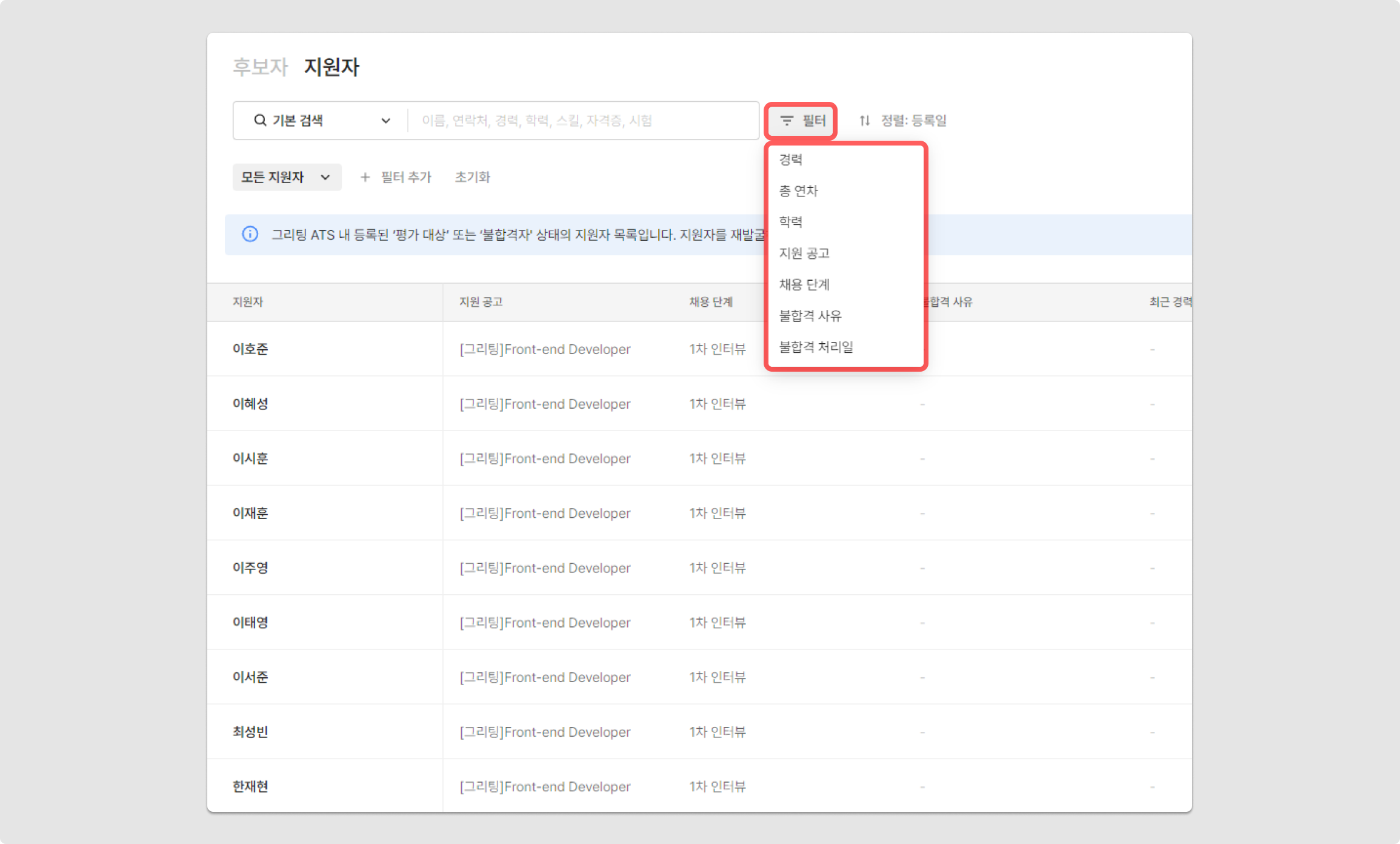 검색 및 필터 기능을 활용하여, 지원자를 빠르게 검색할 수 있습니다.