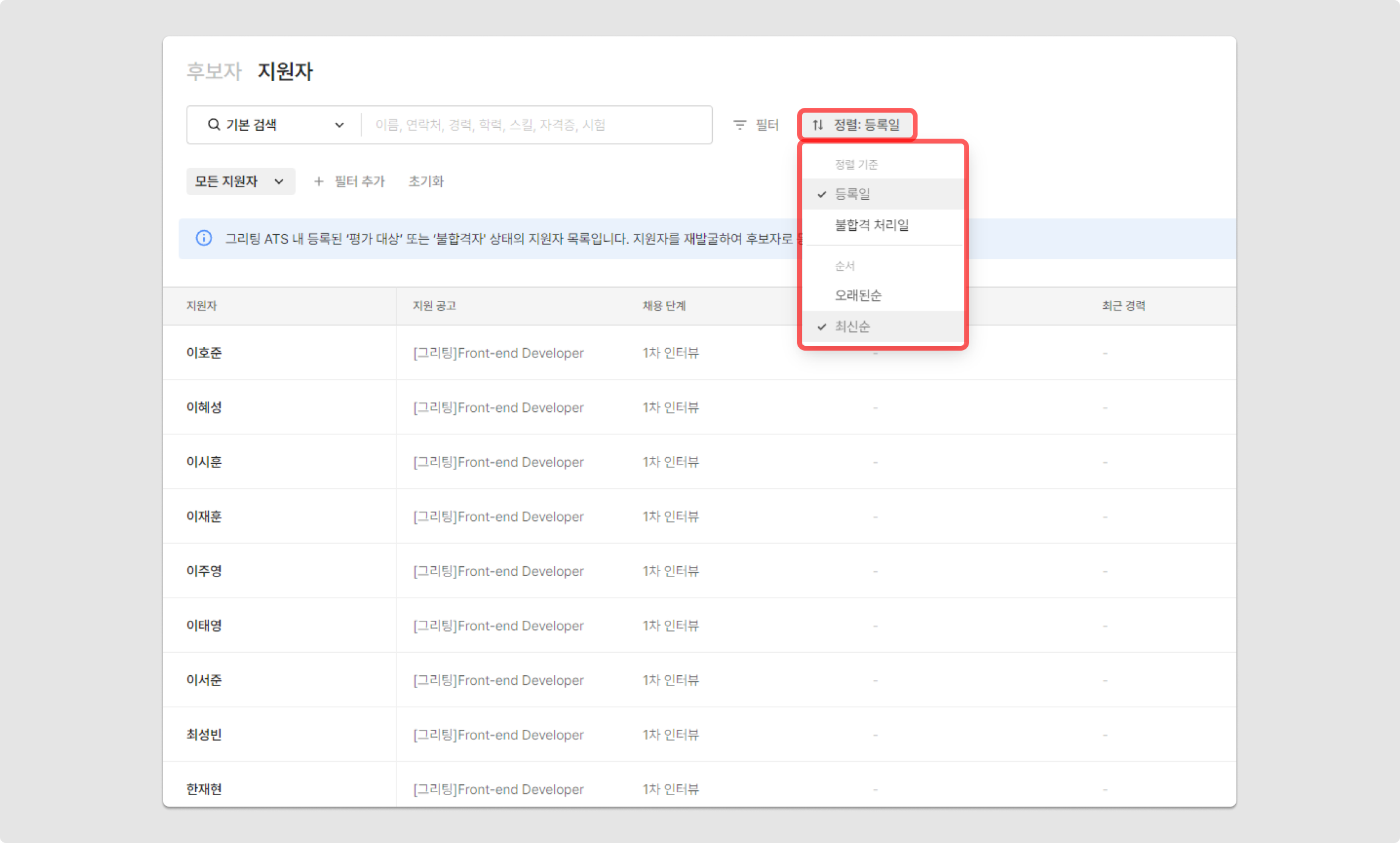 아래의 기준으로 지원자 데이터를 정렬하여 확인할 수 있습니다.