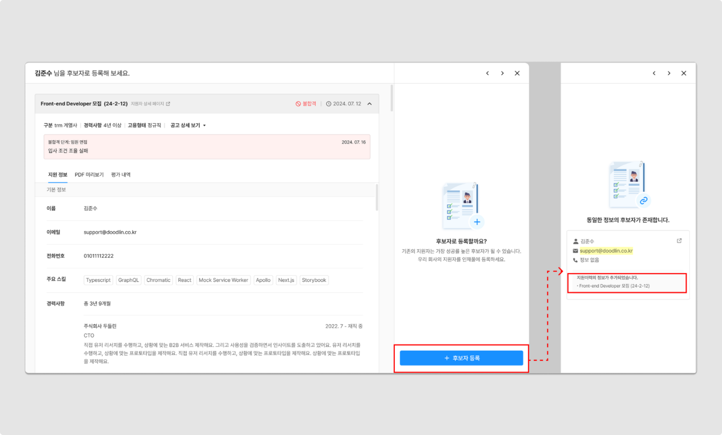 후보자 등록 시, 그리팅 ATS에 등록된 지원자의 모든 정보 및 이력서 파일이 자동으로 함께 저장됩니다.