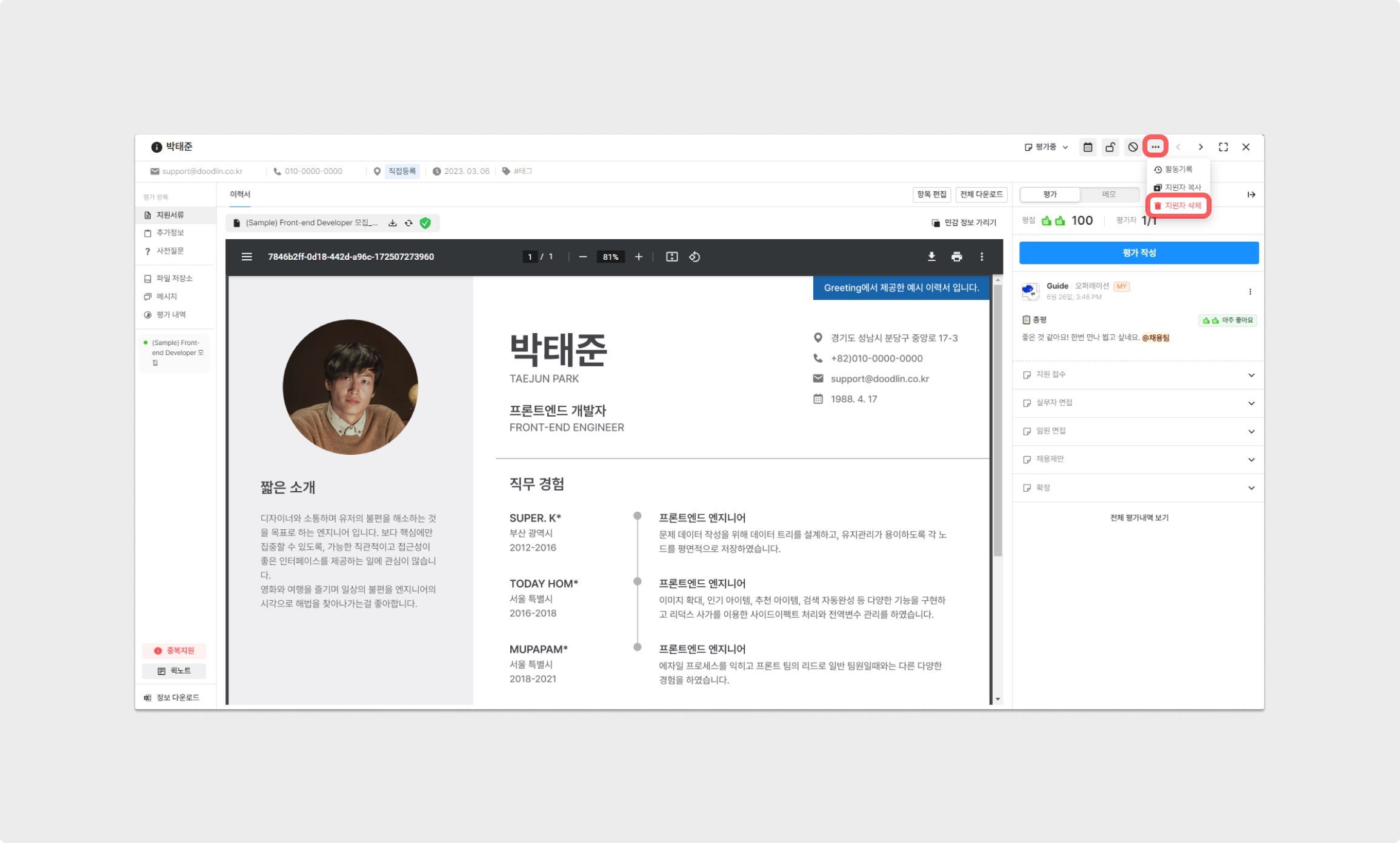접수 내역을 삭제할 지원자를 클릭 후, 우측 상단의 더보기(점 세 개) → 지원자 삭제 버튼을 클릭해주세요.