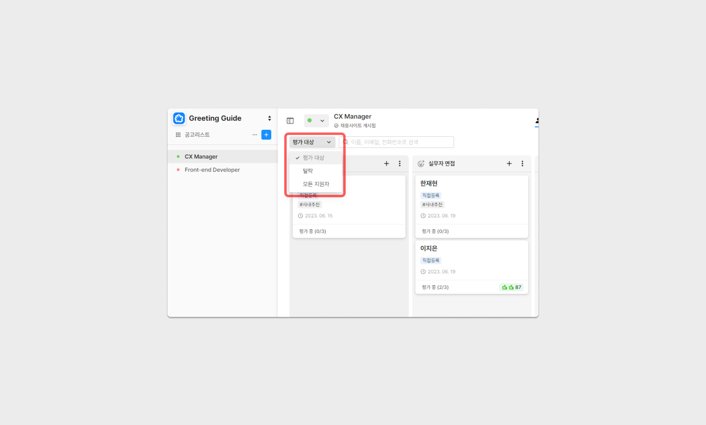또한, 채용 상태에 따른 필터링 역시 가능해, 불합격한 지원자만을 확인하거나 모든 지원자를 확인할 수 있도록 설정 가능합니다.