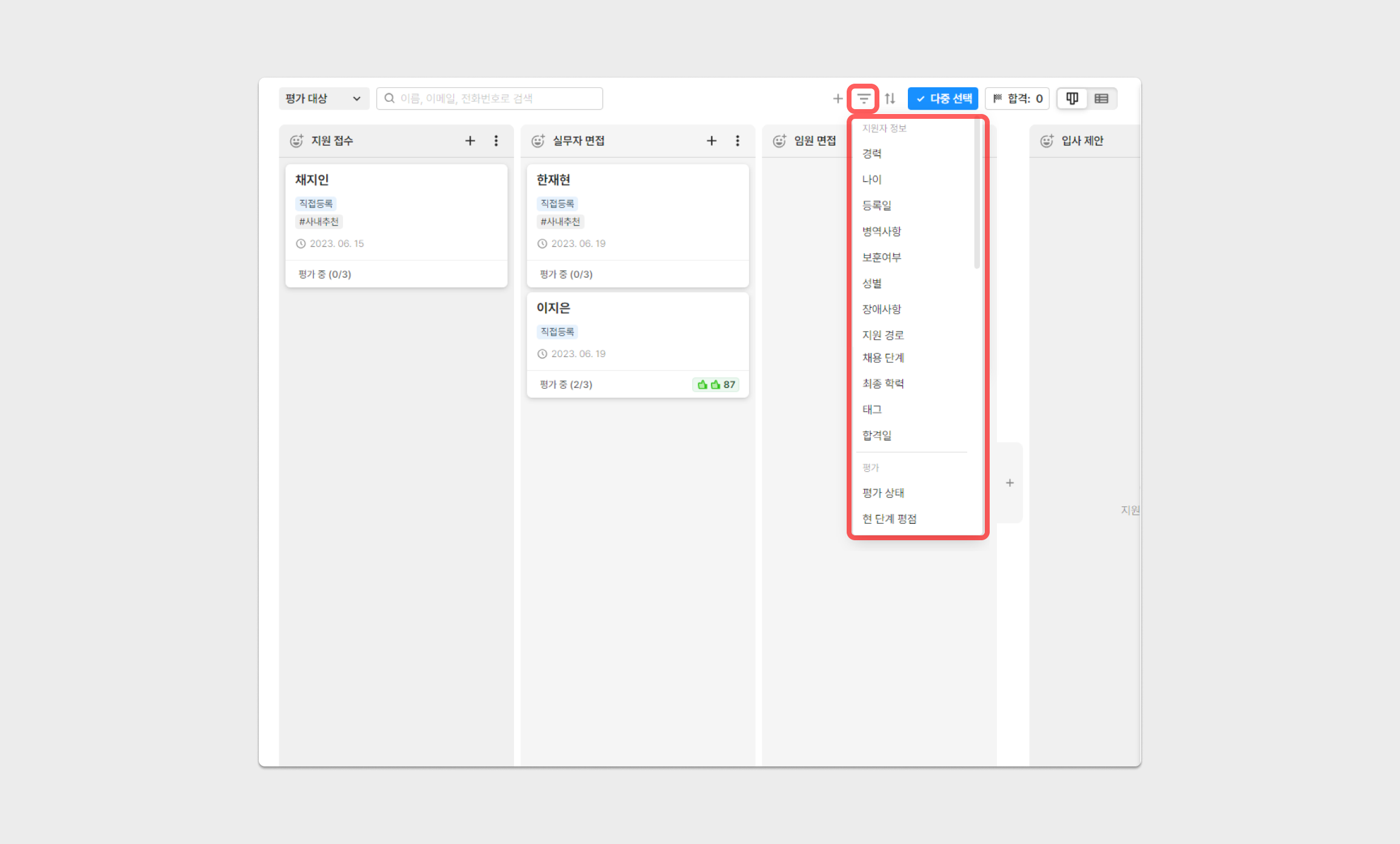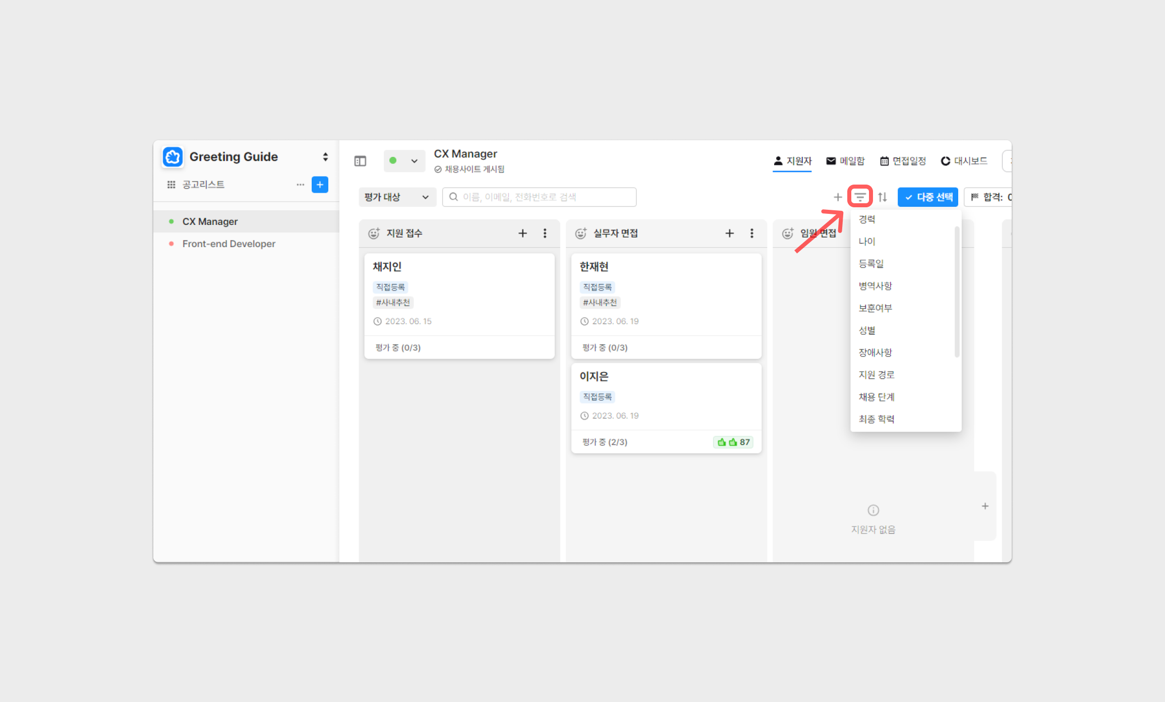 특정 조건에 해당하는 지원자만을 확인해야 한다면, [필터] 기능을 통해 원하는 지원자만 나타날 수 있도록 설정 가능합니다.
