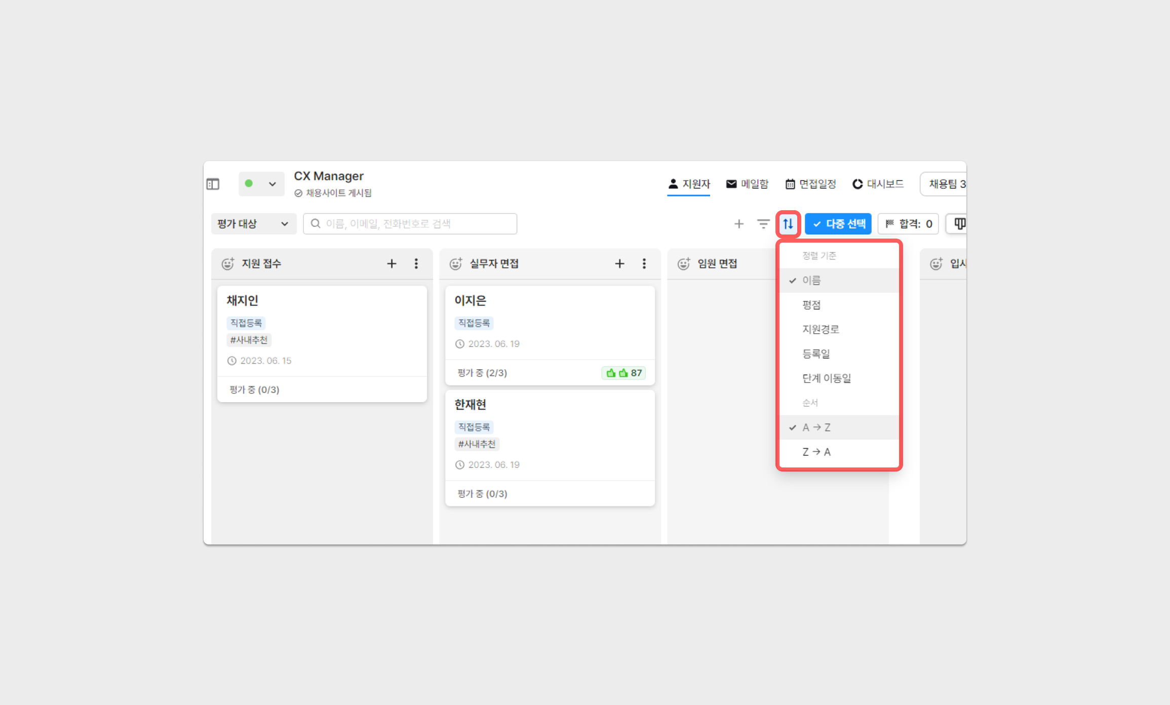 지원자 리스트의 [정렬 기준]을 이름 ∙ 평점 ∙ 지원경로 ∙ 단계 이동일으로 설정할 수 있으며, 그 순서는 오름차순(A~Z) 및 내림차순(Z~A)로 변경 가능합니다.