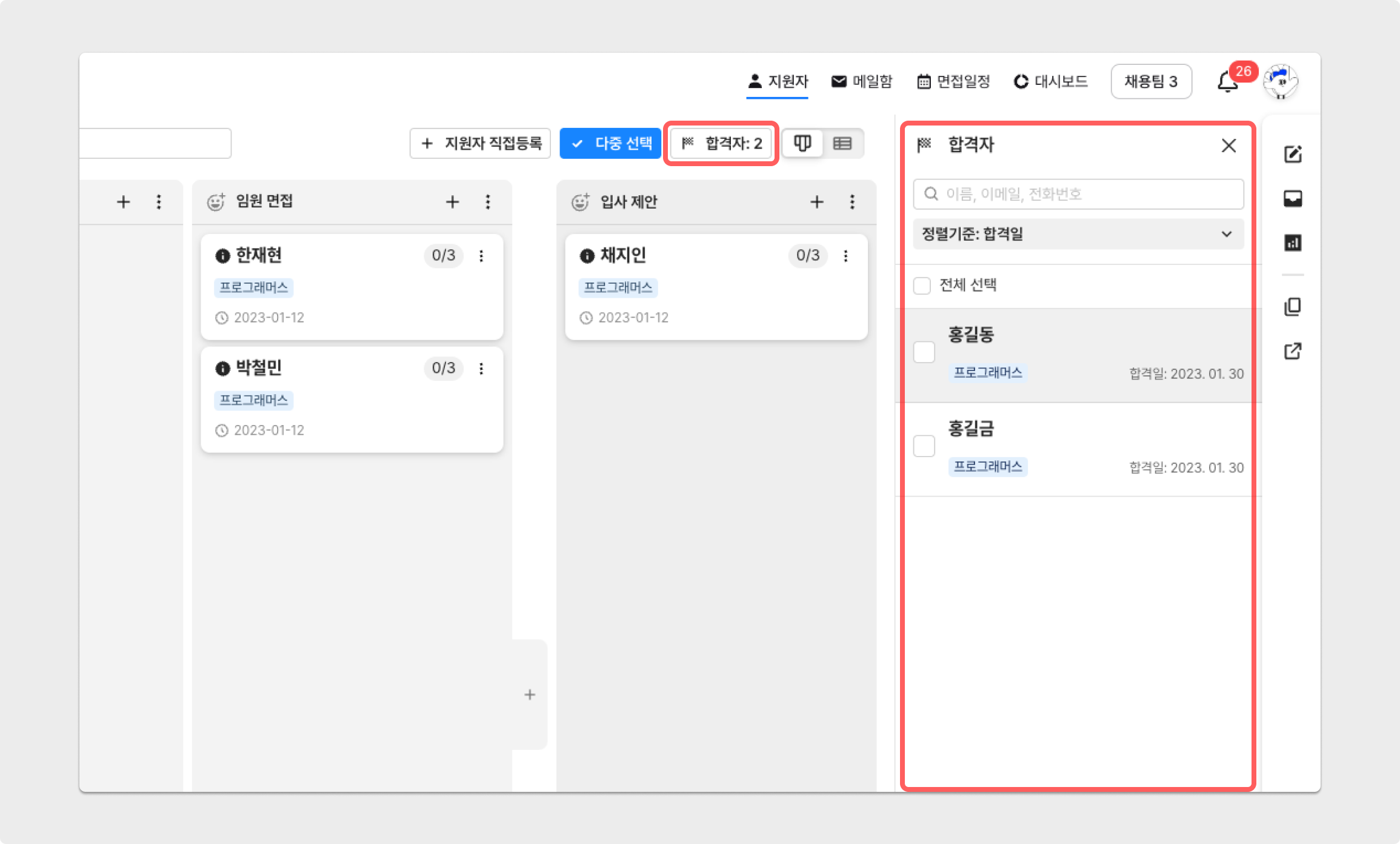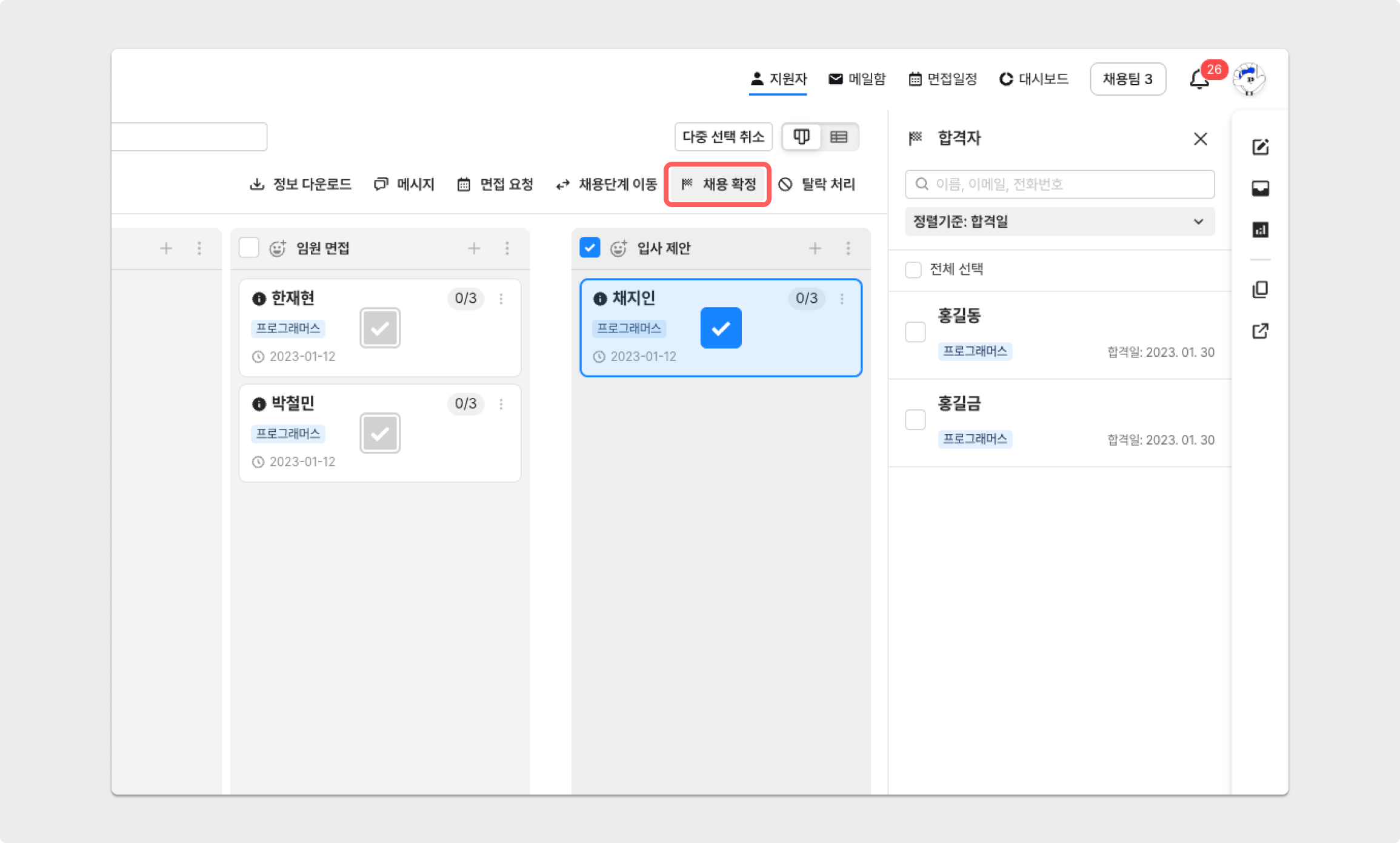 지원자 리스트 화면에서 우측 상단의 [다중 선택]을 클릭해 주세요. 이후 합격자로 정의할 지원자를 다수 선택 후 우측 상단의 [채용 확정]을 클릭해 주세요.