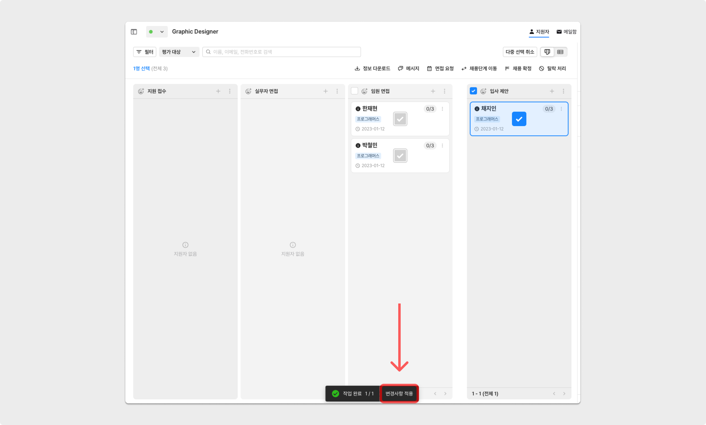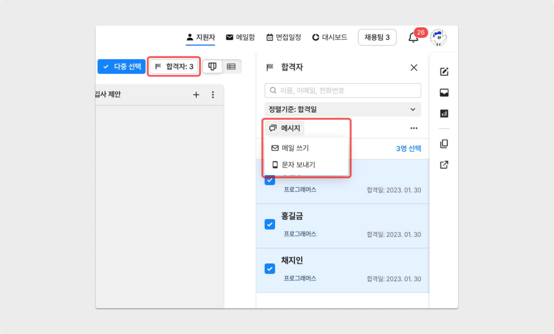 최종적으로 입사가 확정된 지원자를 [합격자]로 분류하여 지원자 리스트의 가시성을 확보할 수 있으며, 공고 일반 혹은 커스텀 역할 멤버는 합격자 정보를 열람할 수 없습니다.