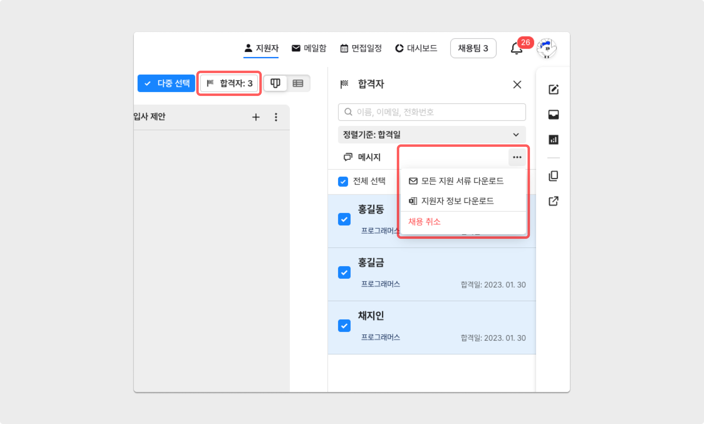 각종 데이터 다운로드와 채용을 취소(합격자 정의 취소)할 수도 있습니다.
