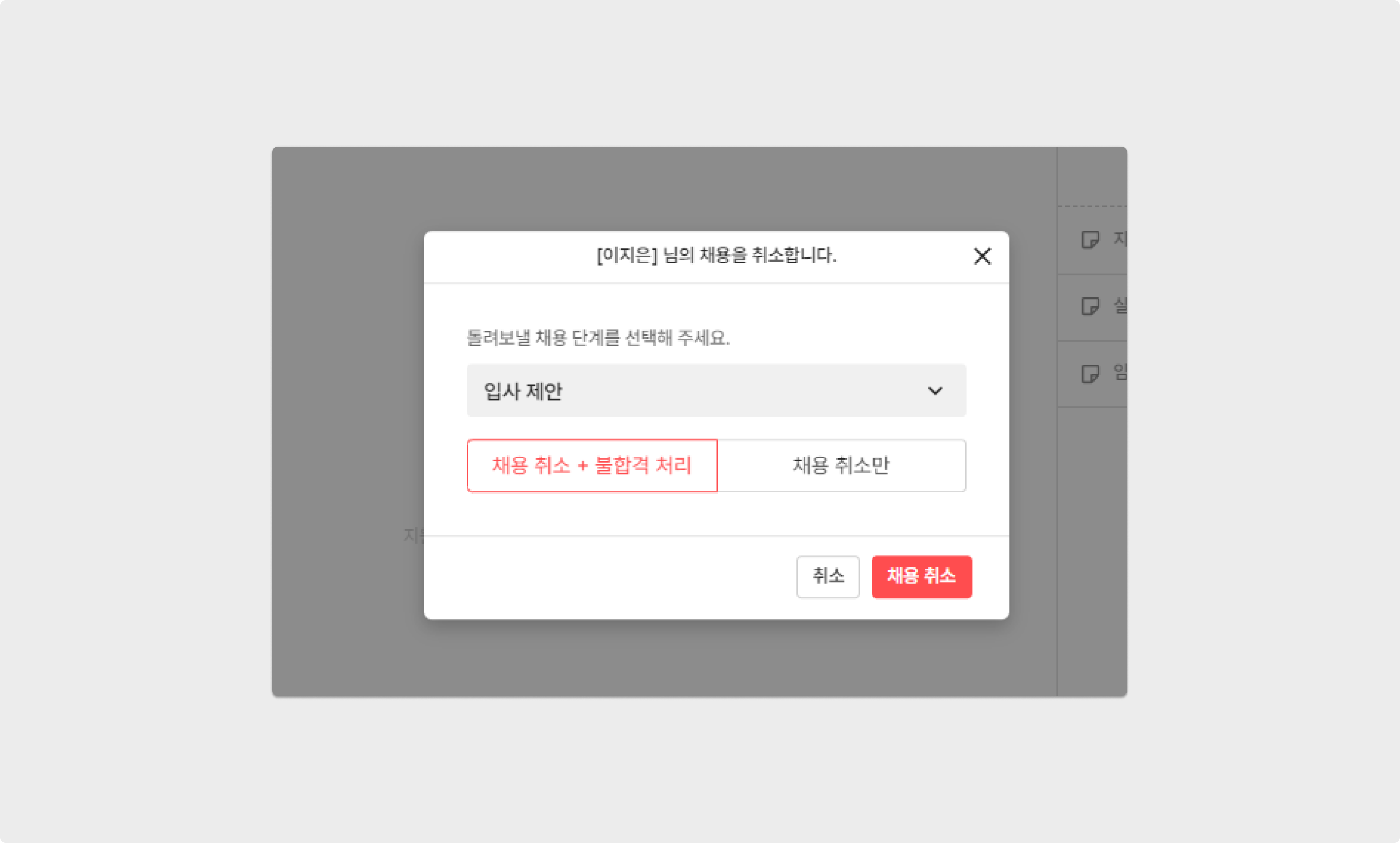 채용을 취소할 때는 불합격 처리까지 함께 조치하거나, 합격 상태만을 취소할 수 있습니다.