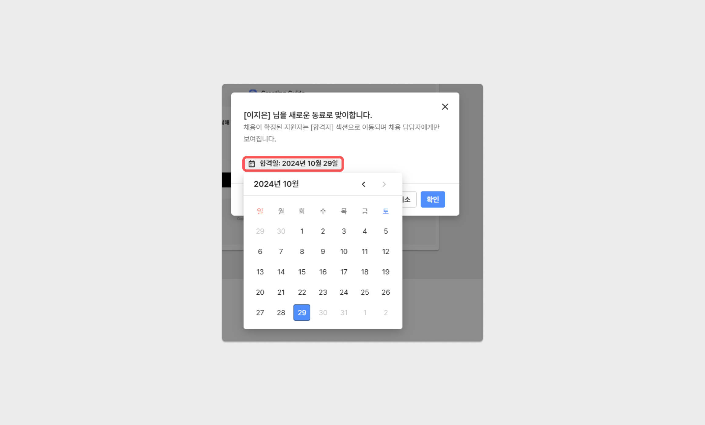 지원자 채용 확정 과정에서 특정 일자로 합격일을 지정할 수 있으며, 지정된 일자는 추후 변경이 가능합니다.
