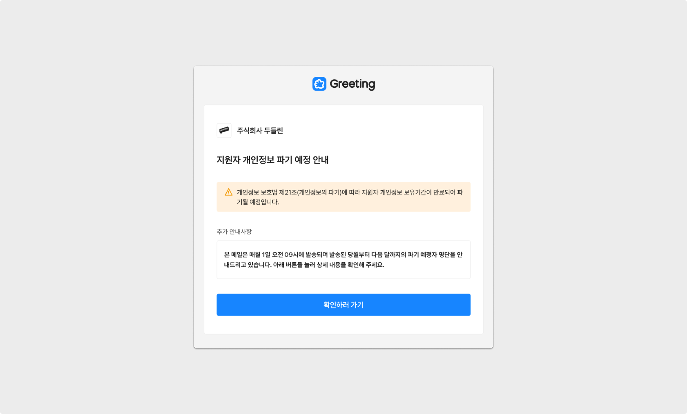 워크스페이스의 소유자 및 관리자에게 관련 안내 메일이 매월 1일 오전 09시(UTC +9)에 발송되며, 발송된 당월부터 다음 달까지의 파기 예정자 명단을 확인할 수 있습니다.