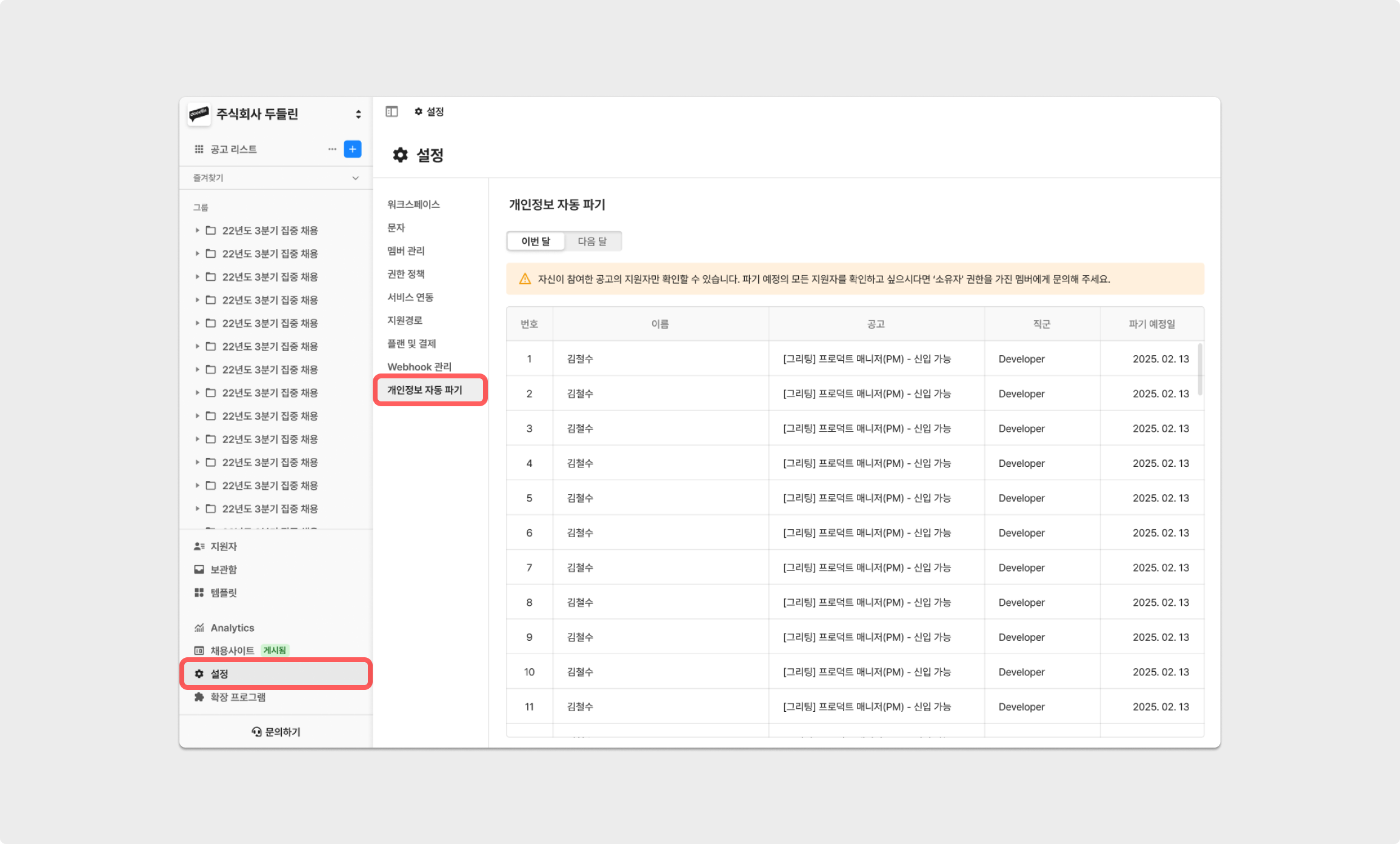 파기 예정 지원자 목록은 '설정' → '개인정보 자동 파기'에 접근하여 확인할 수 있으며, 접근 권한은 워크스페이스의 소유자 및 관리자에 한합니다.