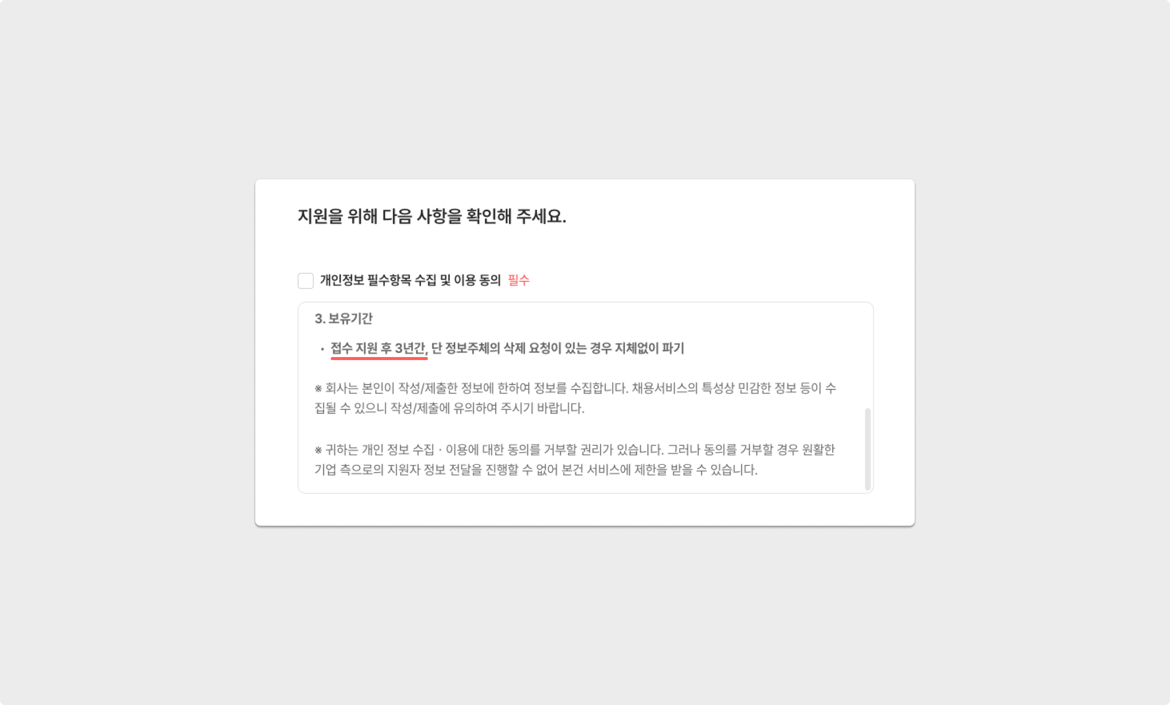 법률에 의거해 안전한 채용 과정을 운영할 수 있도록, 지원자에게 고지하고 있는 개인정보 보유기간에 맞춰 자동 파기 기능을 제공해 드리고 있습니다.