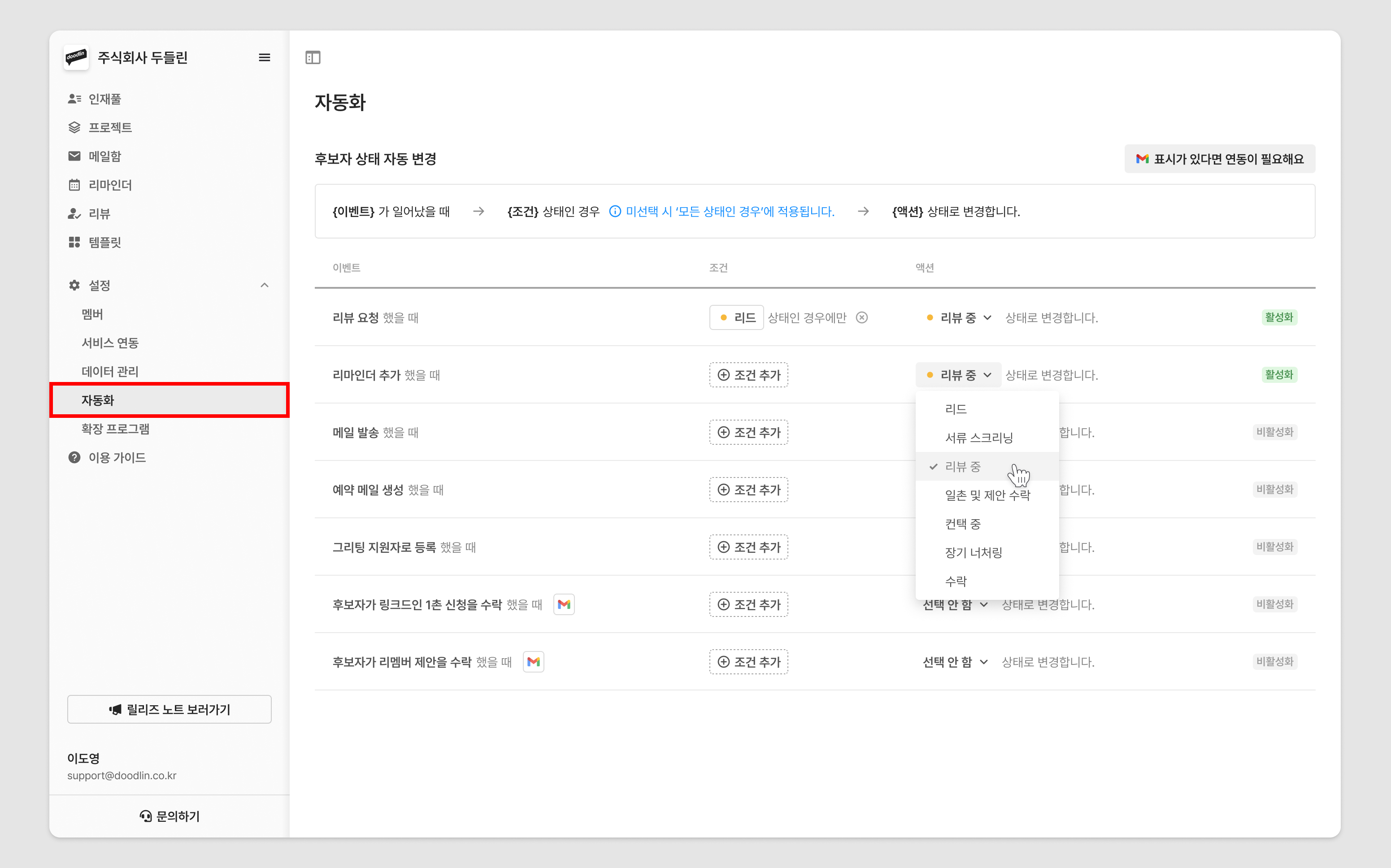 아래와 같은 이벤트에 대해 후보자 상태 자동화를 설정할 수 있습니다.