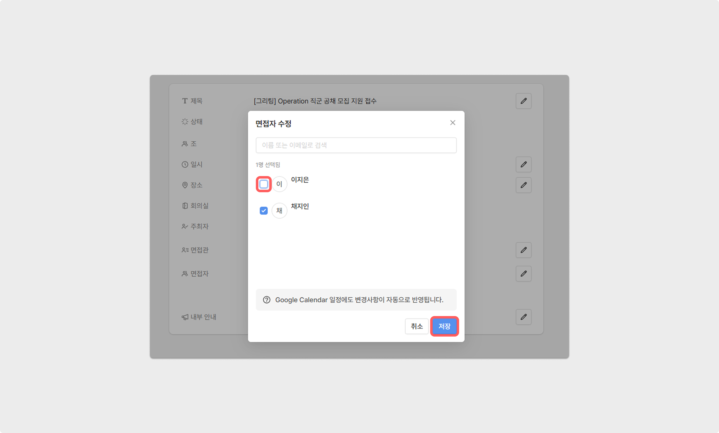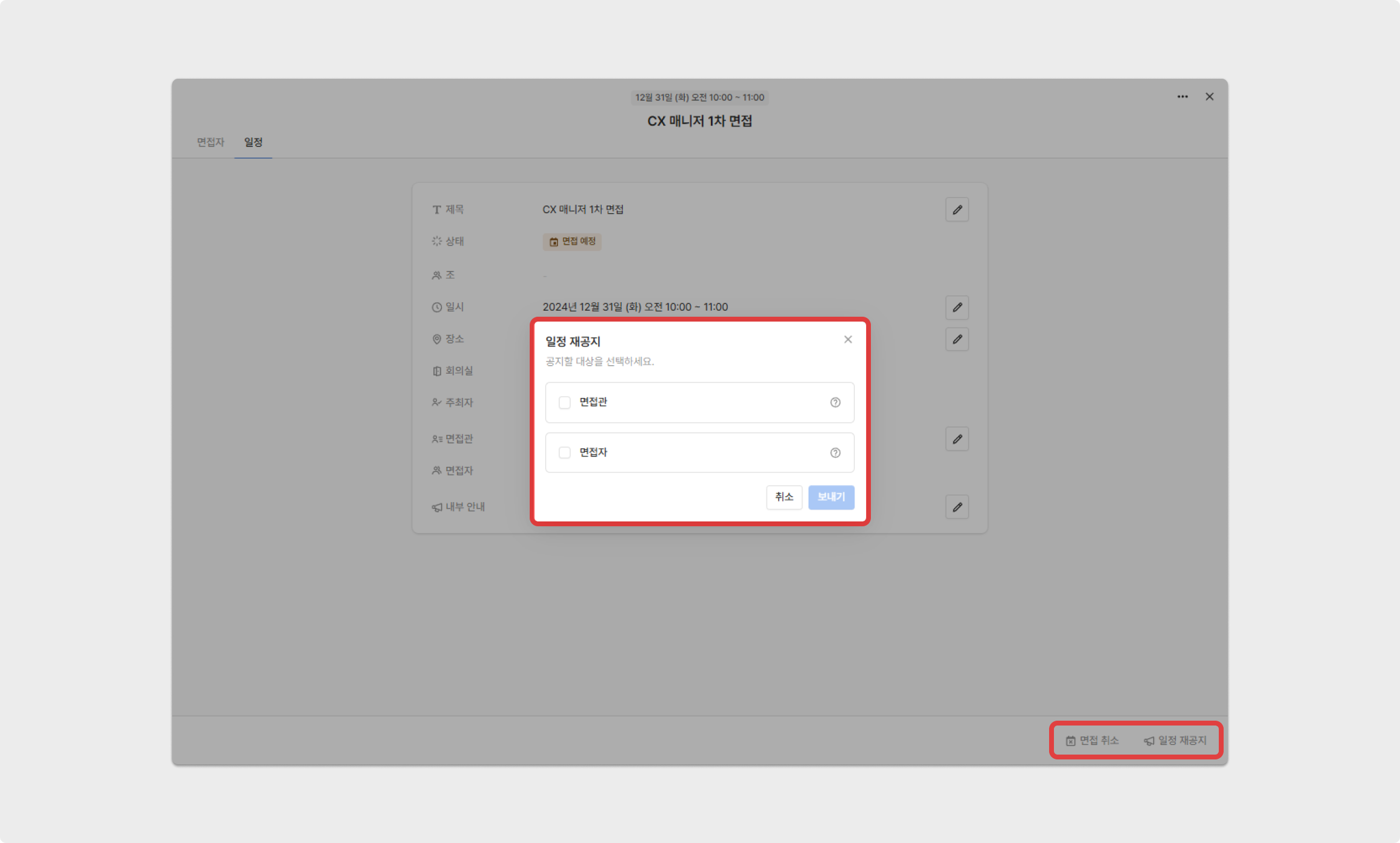 일정을 변경 후 저장 버튼을 클릭하면 변경이 완료되며, 일정 재공지를 통해 지원자와 면접관에게 변경된 일정을 다시 공지할 수 있습니다.