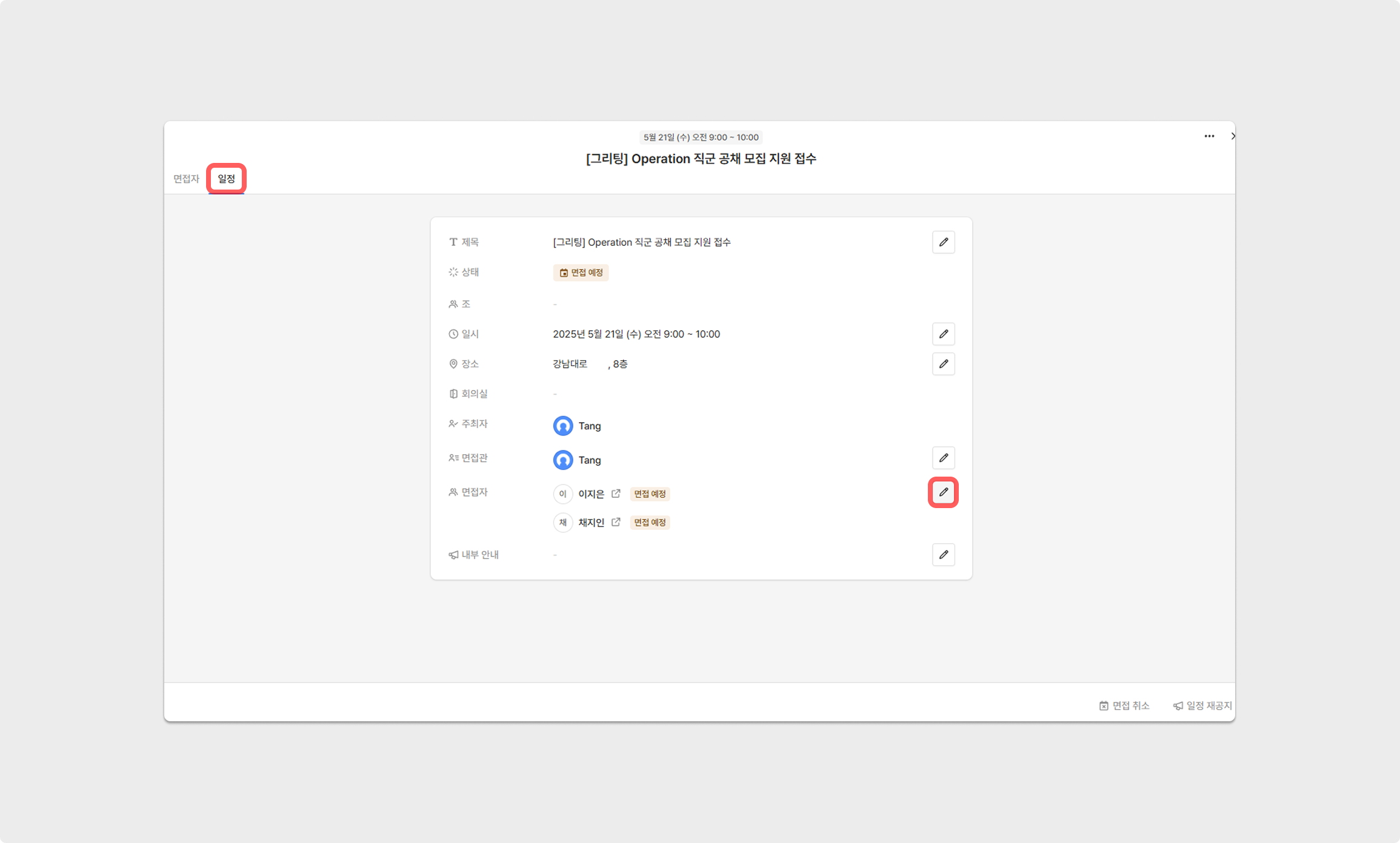 면접 일정이 확정된 지원자를 클릭해 지원자 상세 페이지에 접속 후, 우측 상단에 나타나는 면접일정 확인 버튼을 클릭해 주세요.