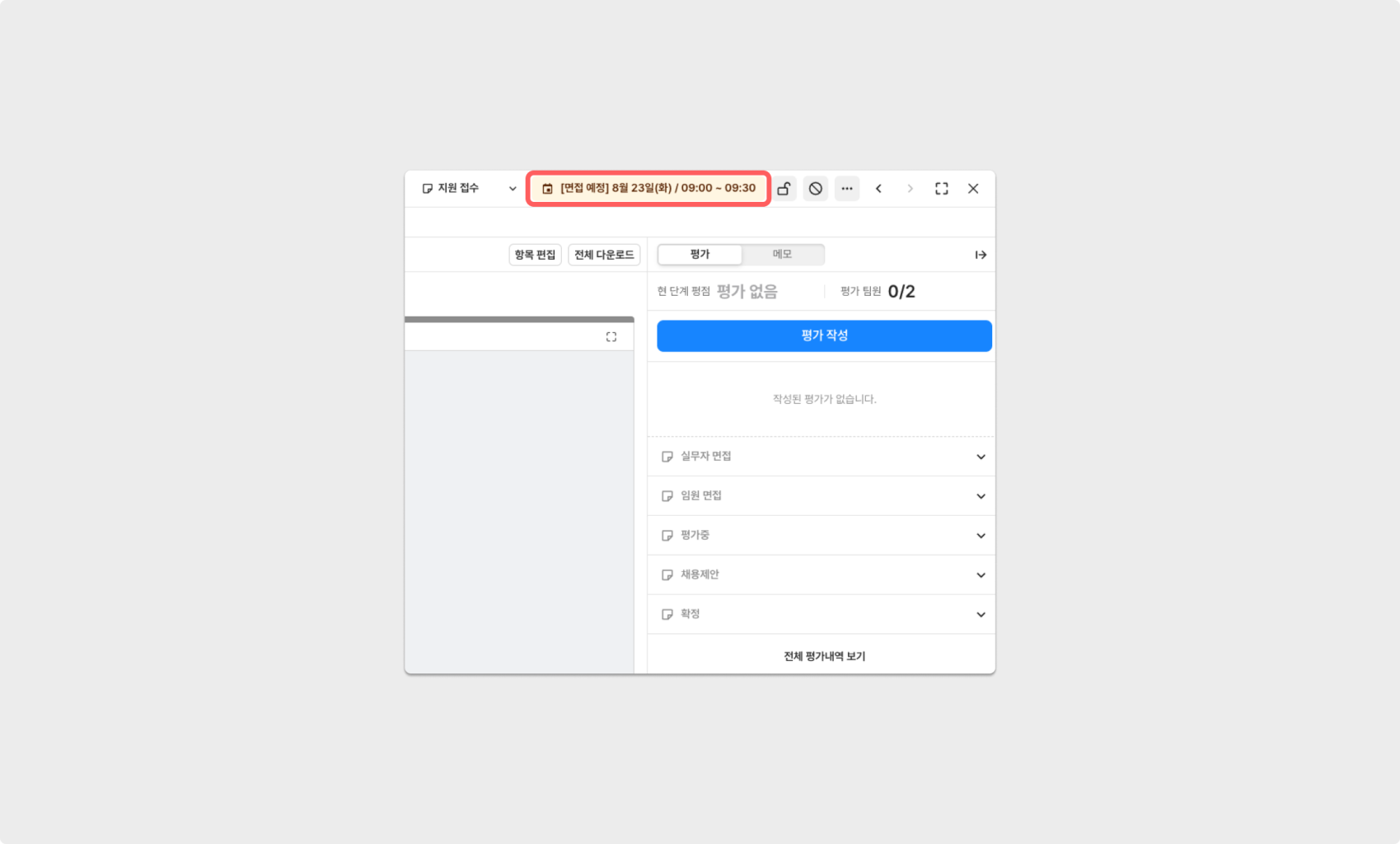 면접일정 변경은 일시에 기록된 날짜에 클릭하여 편리하게 변경할 수 있으며, 이 과정은 지원자가 일정을 다시 선택할 수 있는 메일이 발송되지 않고 곧바로 수정됩니다.