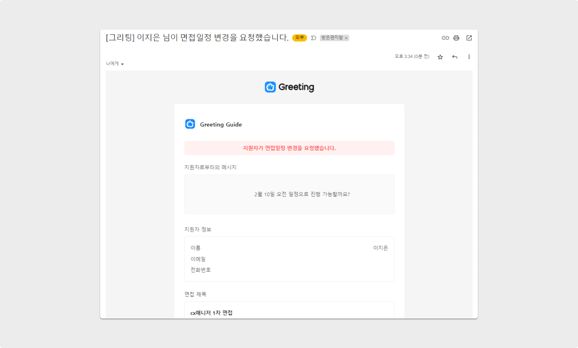 지원자 측으로부터 면접 일정 변경 요청이 접수된다면, 메일 / 슬랙 / 그리팅 내 알림을 통해 확인할 수 있습니다.