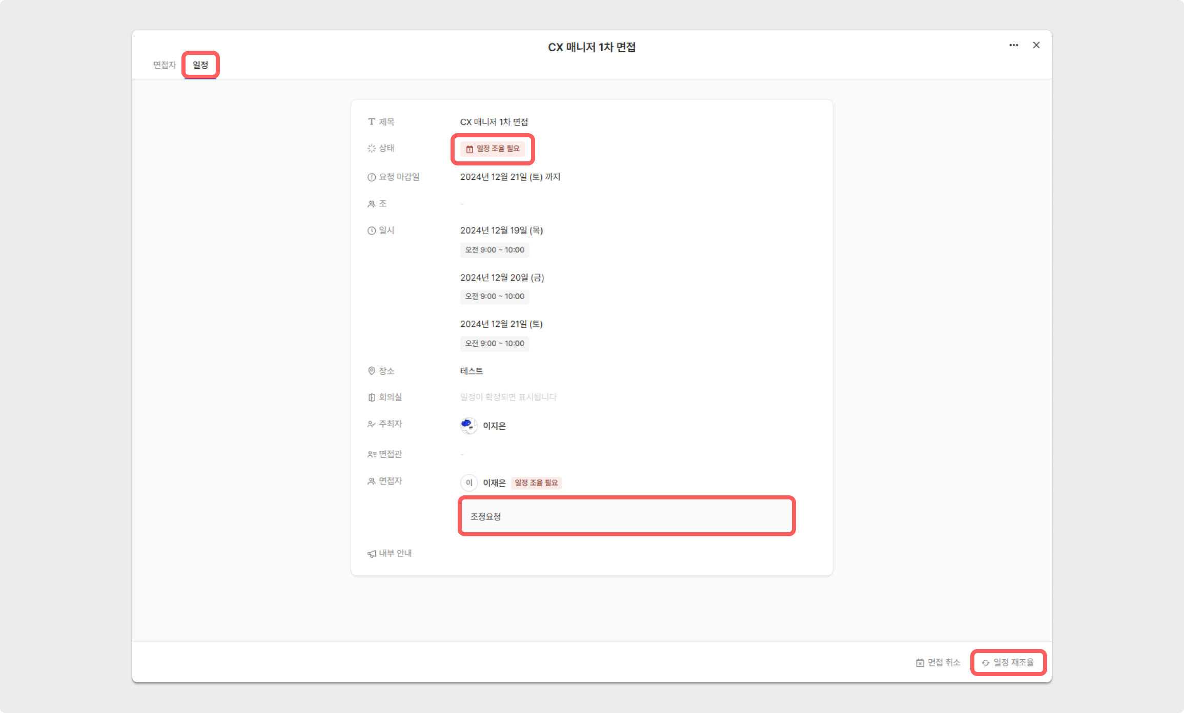 해당 지원자의 지원자 상세 페이지에 접속한 후 우측 상단에 나타나는 일정 변경 요청 버튼을 클릭하거나, 메일과 슬랙 등의 확인하러 가기 버튼을 클릭하면 곧바로 일정 변경 화면이 나타납니다.