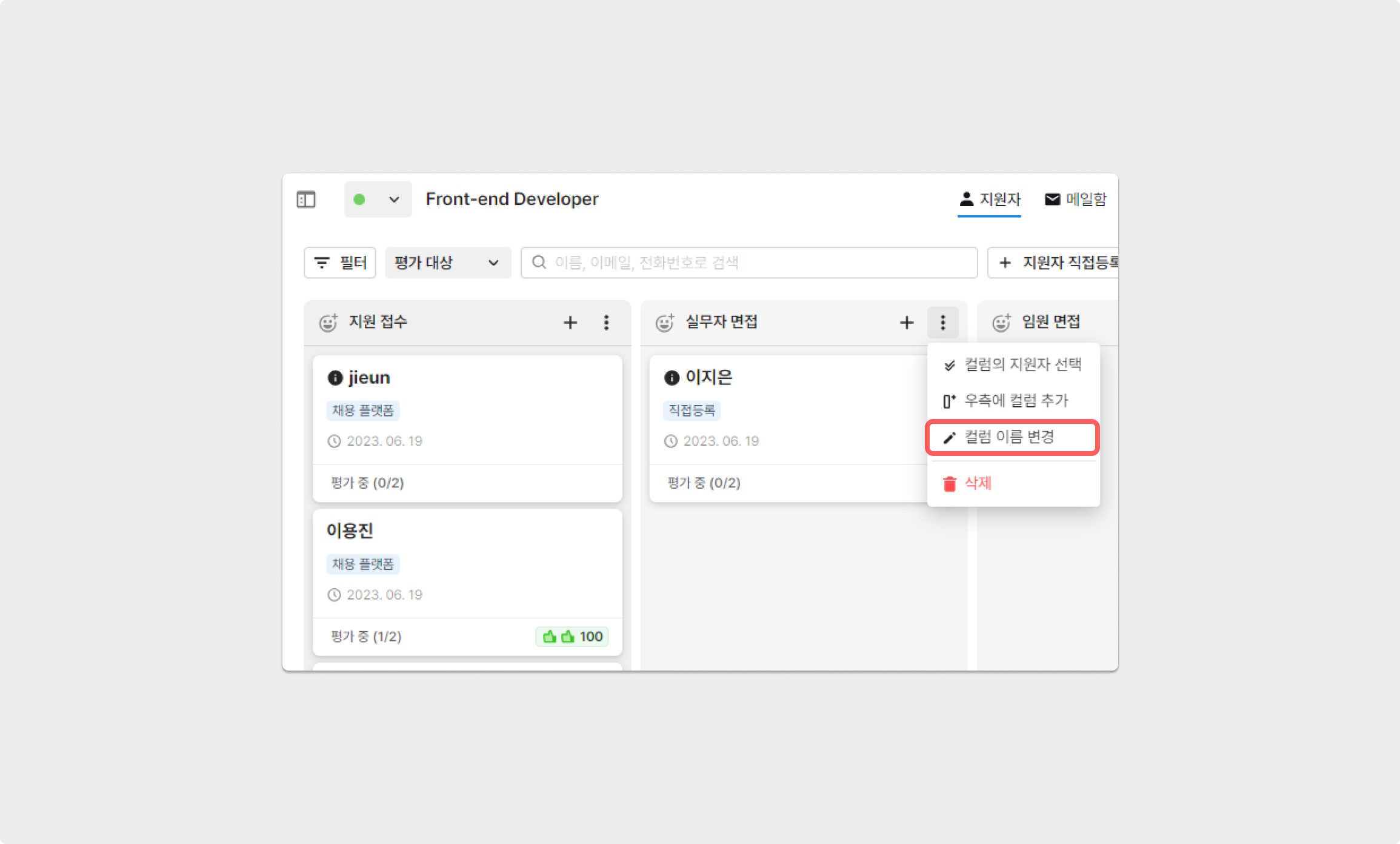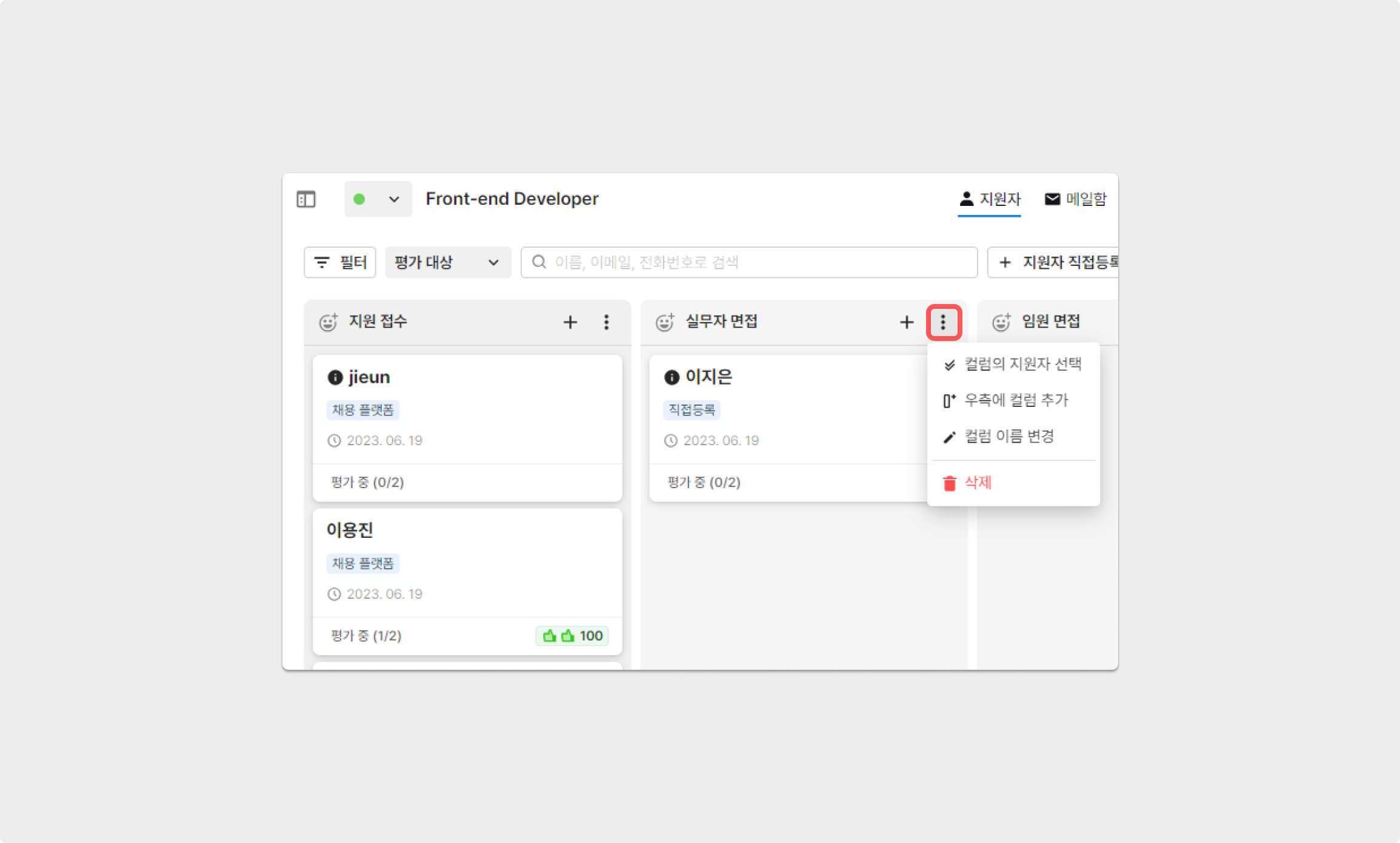 공고 수정 화면에 접속하지 않고, 칸반 보드 형식의 지원자 리스트 화면에서 즉시 컬럼(채용 단계) 추가가 가능합니다.