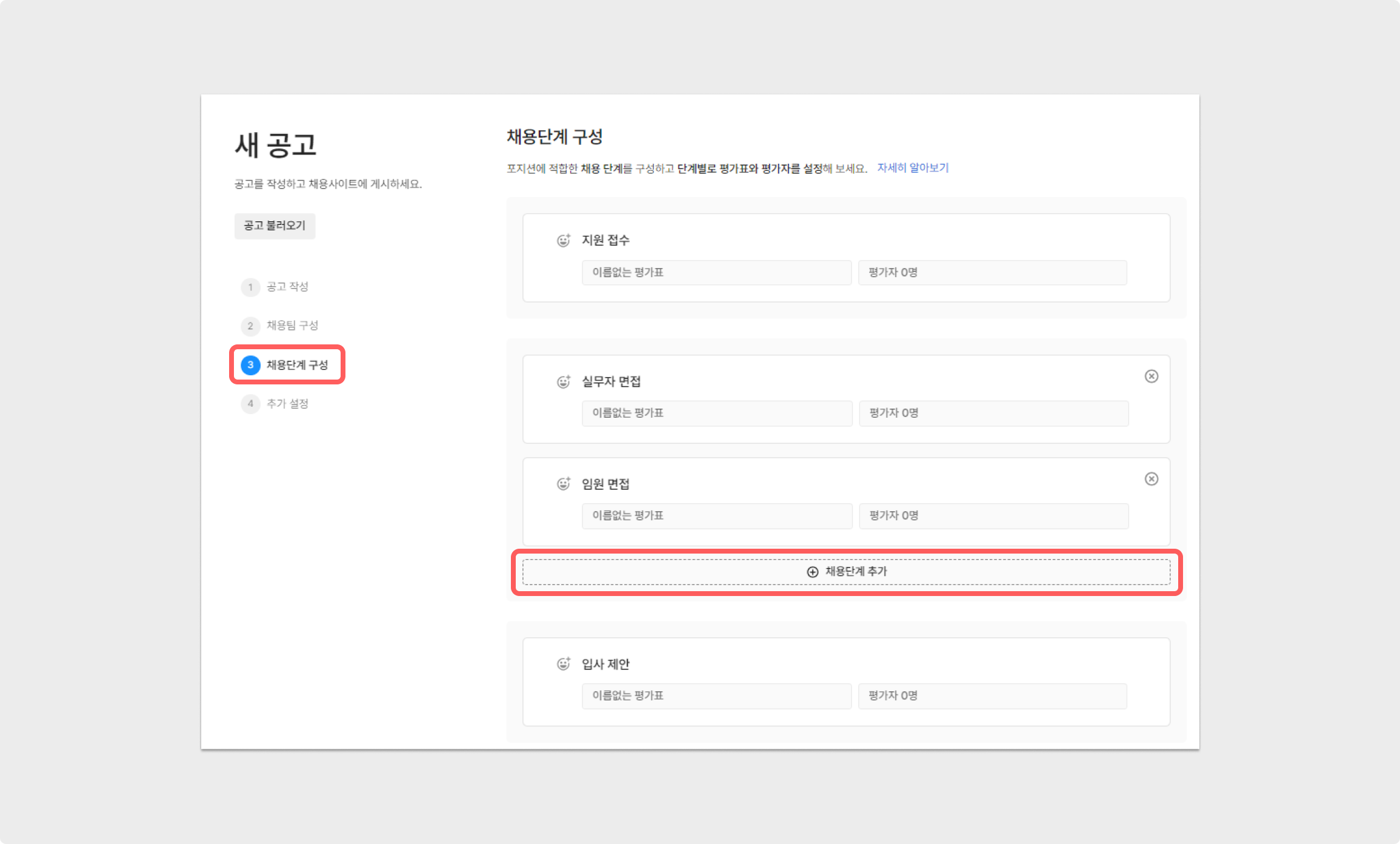 새롭게 생성된 채용 단계의 이름을 입력할 수 있으며, 각 단계별로 평가지와 평가자를 구성할 수 있습니다.