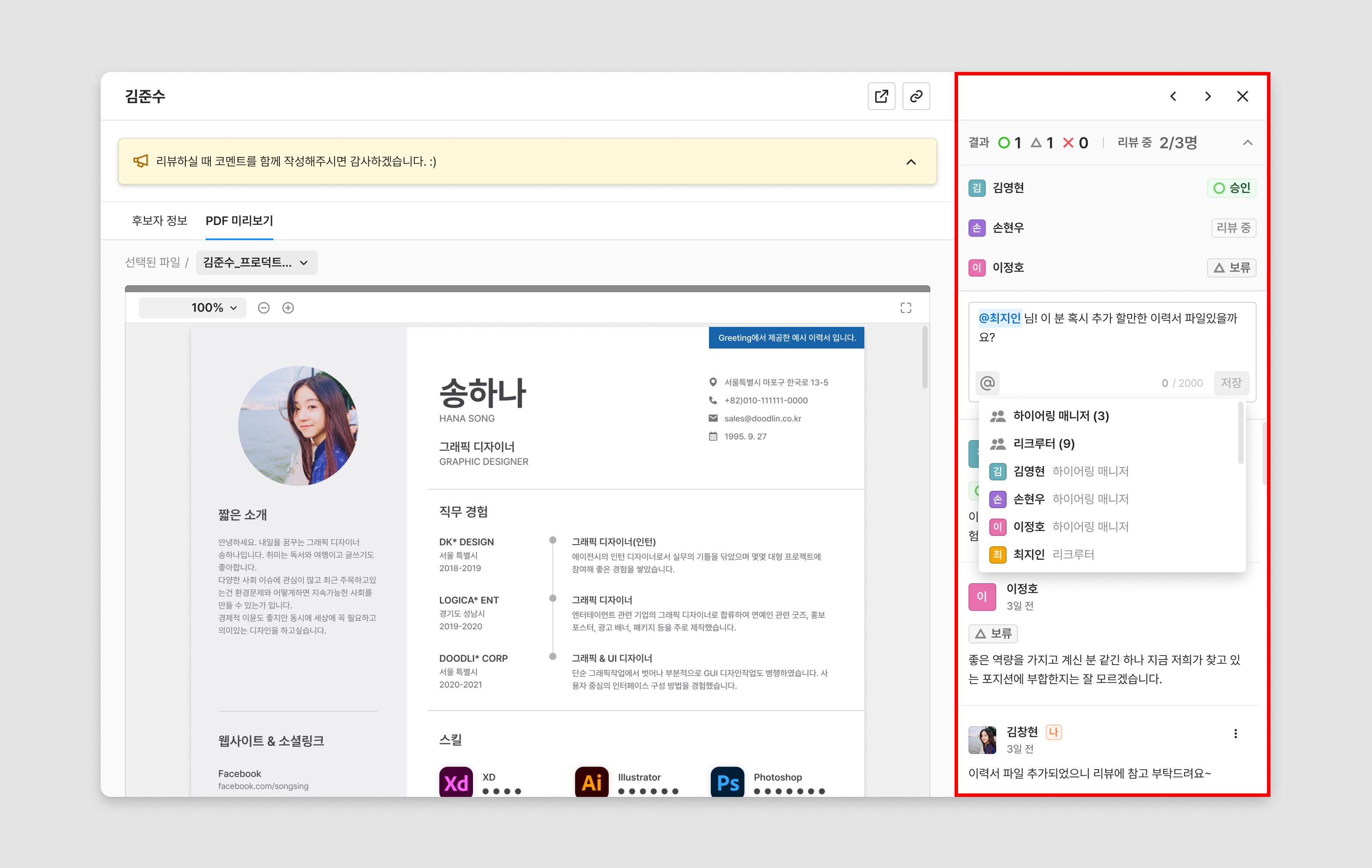 아래 이미지와 같이 리뷰 상세 화면에서는 해당 후보자에게 접근이 가능한 모든 멤버들간 코멘트를 공유하고, 멘션할 수 있습니다.