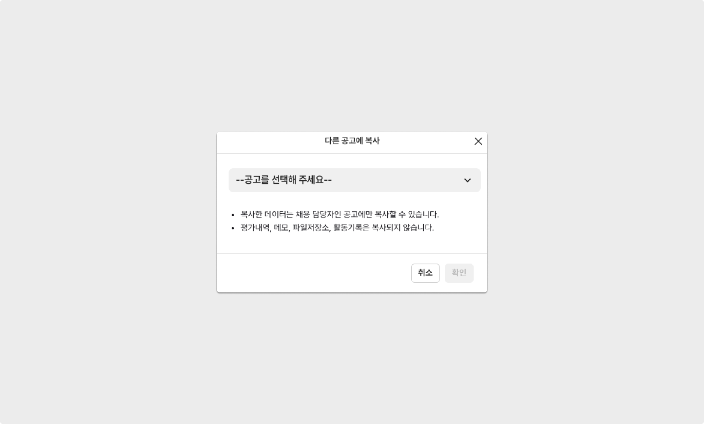 지원자 복사란지원자 복사는 한번의 클릭으로 지원자 정보를 타 공고로 복사할 수 있는 기능입니다.지원자 등록 권한이 있는 공고에만 복사할 수 있으며, 평가내역, 메모, 파일 저장소, 활동기록은 복사되지 않습니다.지원자 복사 방법데이터를 복사할 지원자를 클릭 후, 우측 상단의 더보기(점 세 개) → 다른 공고에 복사 버튼을 클릭해주세요.지원자 복사하기이후, 옮겨질 공고와 채용 단계를 선택하여 확인 버튼을 클릭해 지원자 복사를 마무리할 수 있습니다.공고 및 채용 단계 선택