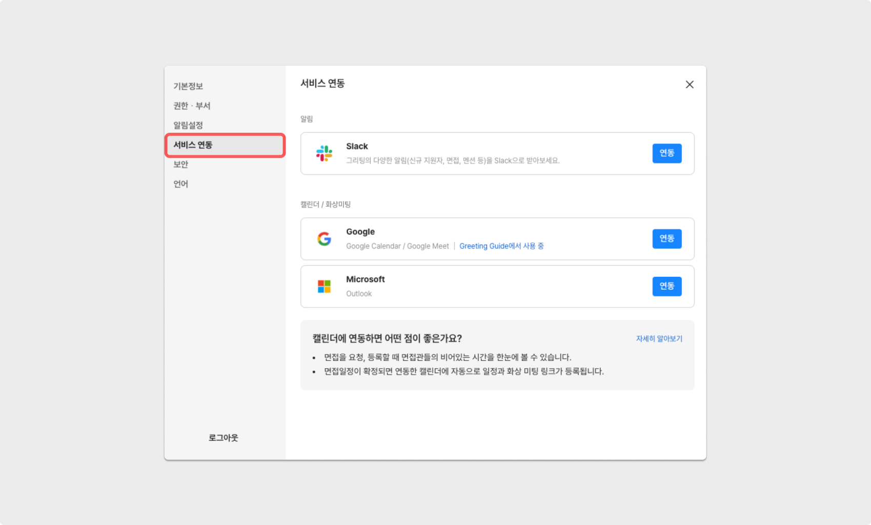 캘린더 연동을 완료했다면, 그리팅을 통해 화상 면접 링크를 생성할 수 있습니다.