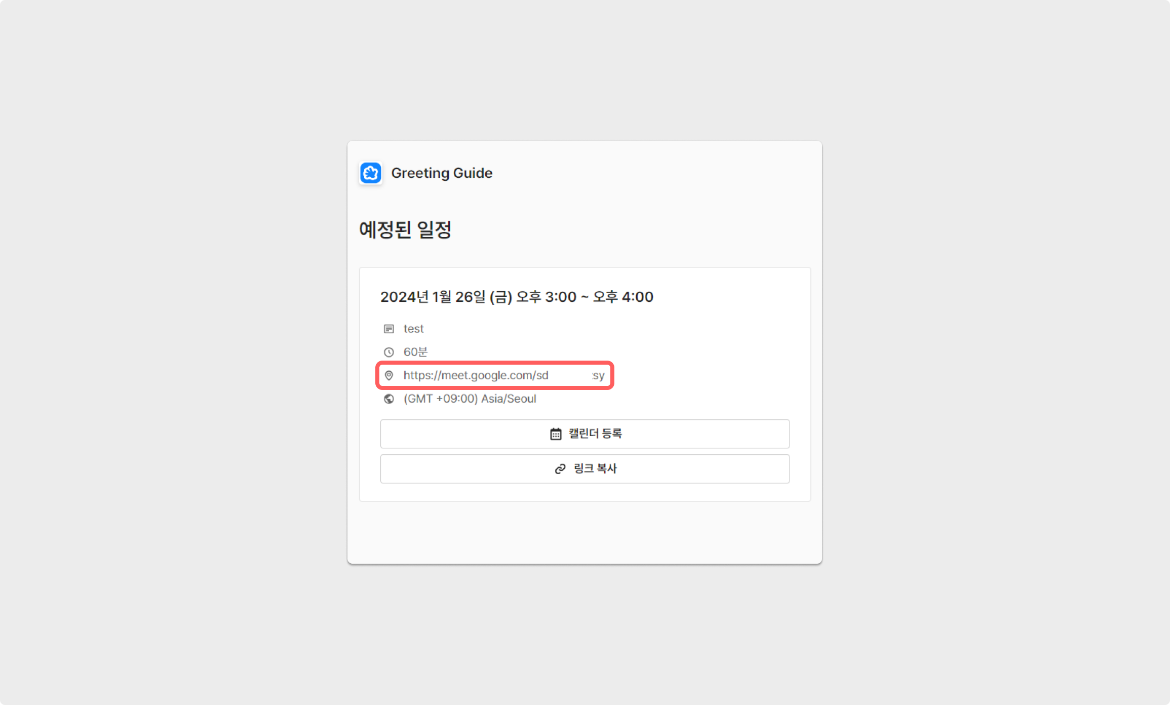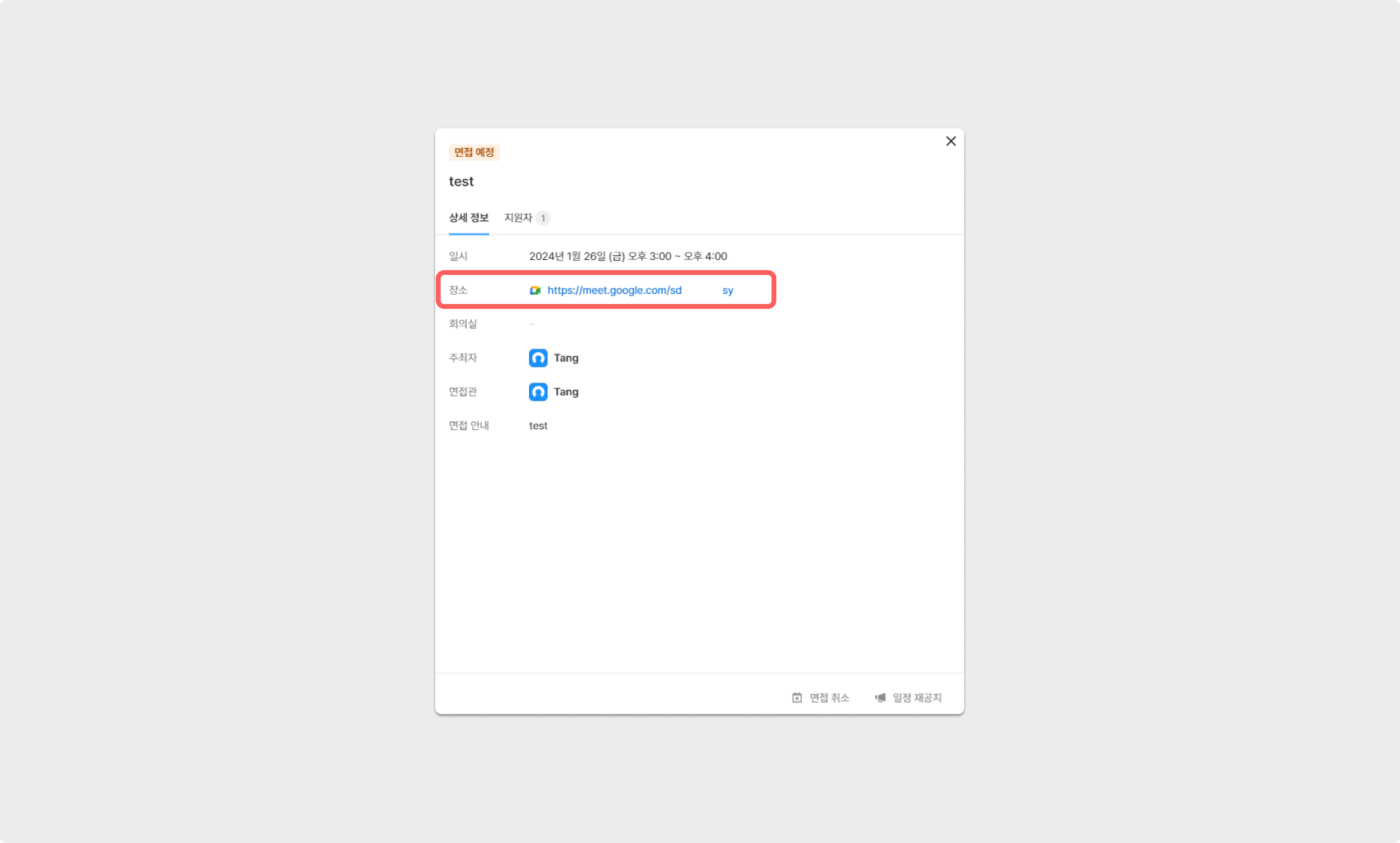 지원자가 면접 일정을 확정했다면, 링크가 생성되어 아래와 같이 안내됩니다.