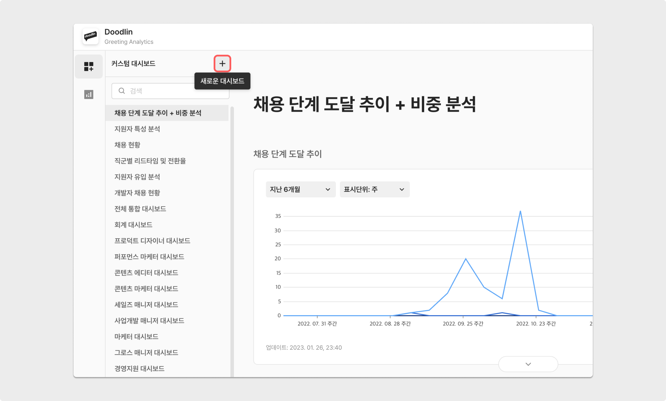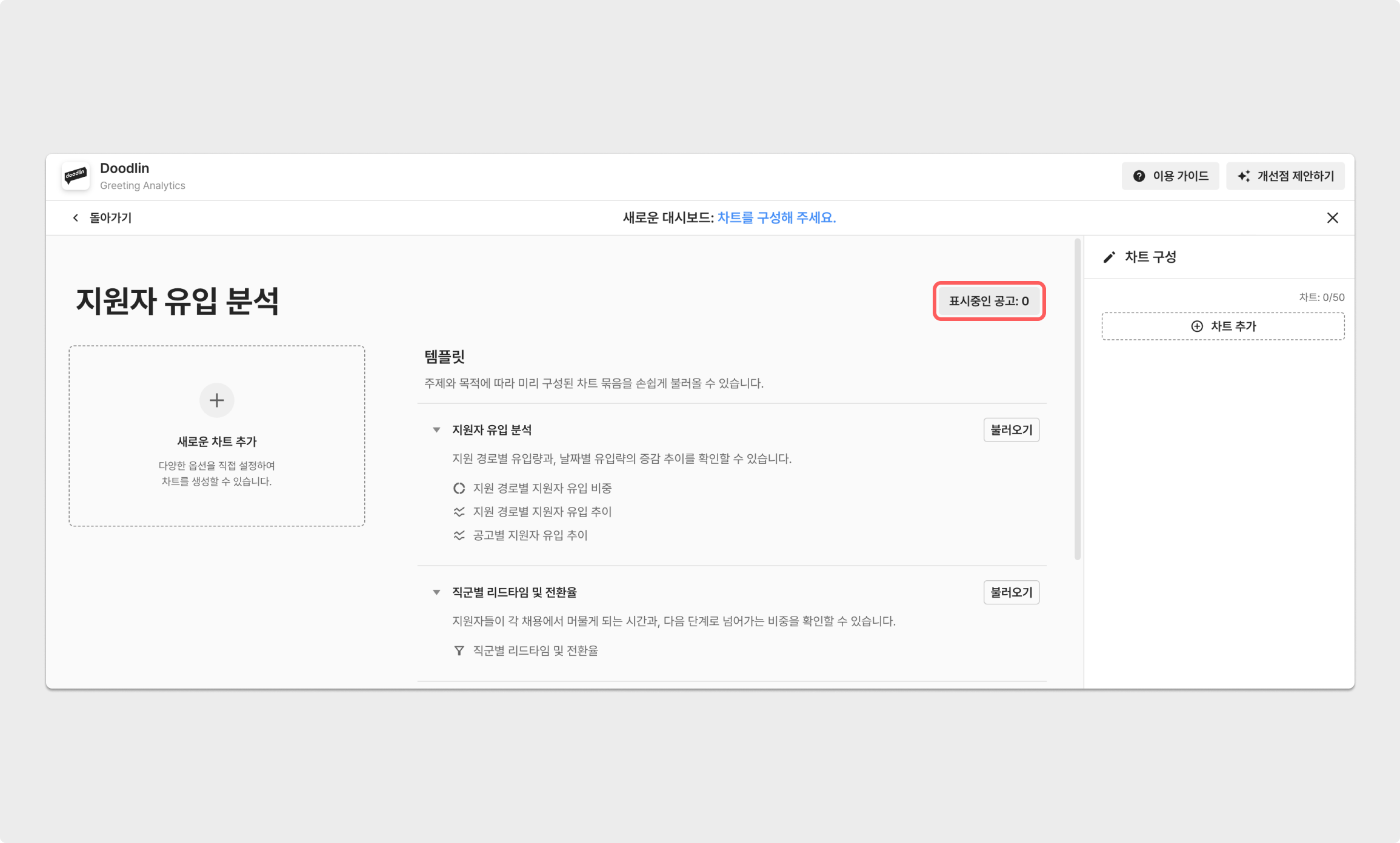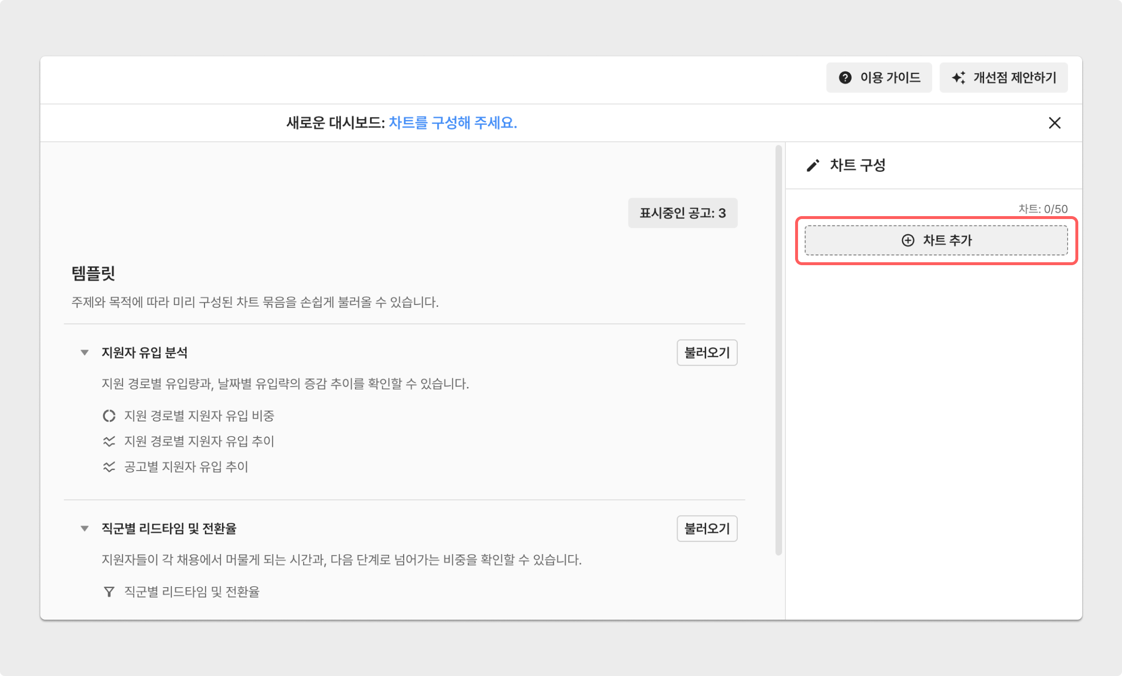 [커스텀 대시보드]를 통해 전체 혹은 다수 공고의 다양한 데이터를 하나의 대시보드에 통합하여 분석할 수 있습니다.