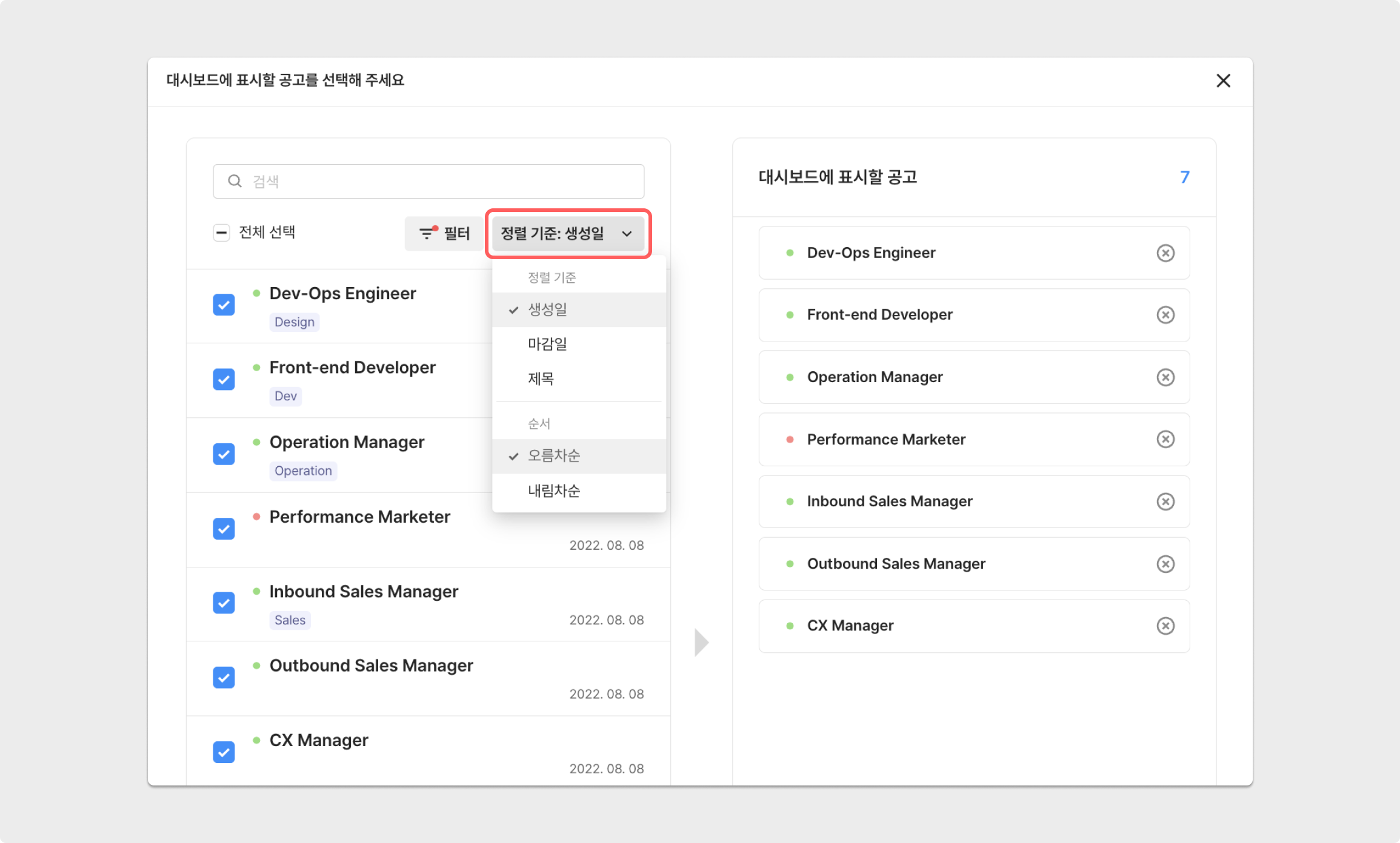 정렬 기준은 '공고 생성일 / 마감일 / 제목 기준'과 순서는 '오름 및 내림차순'으로 설정 가능합니다.