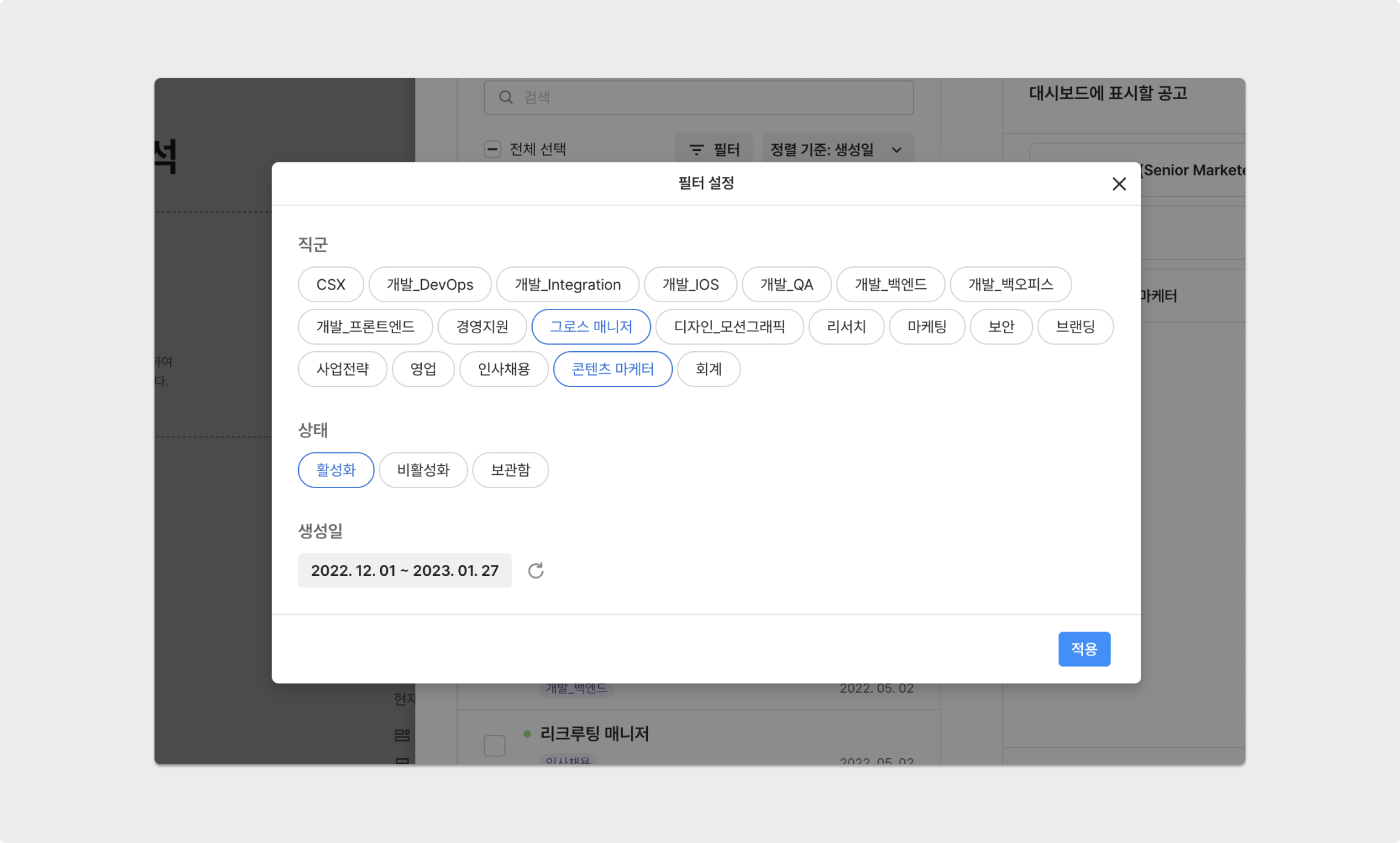 필터는 '직군 / 상태 / 생성일'을 기준으로 설정할 수 있습니다.