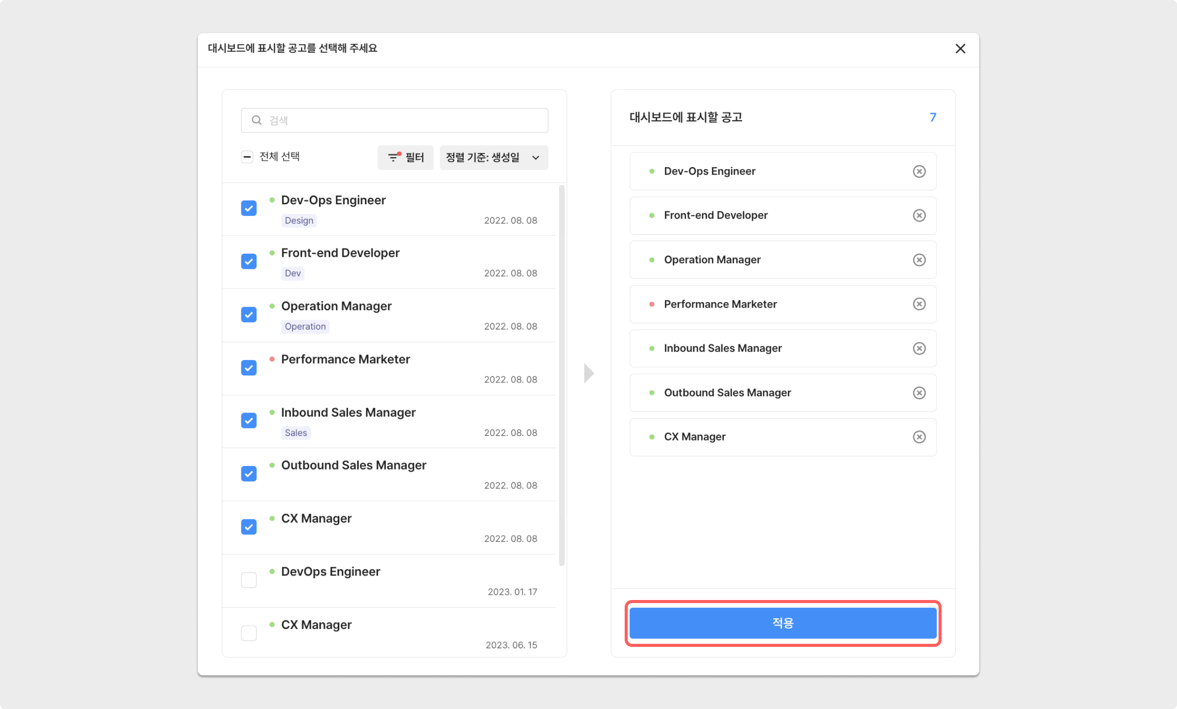 원하는 공고를 선별했다면 [적용] 버튼을 클릭해 주세요.