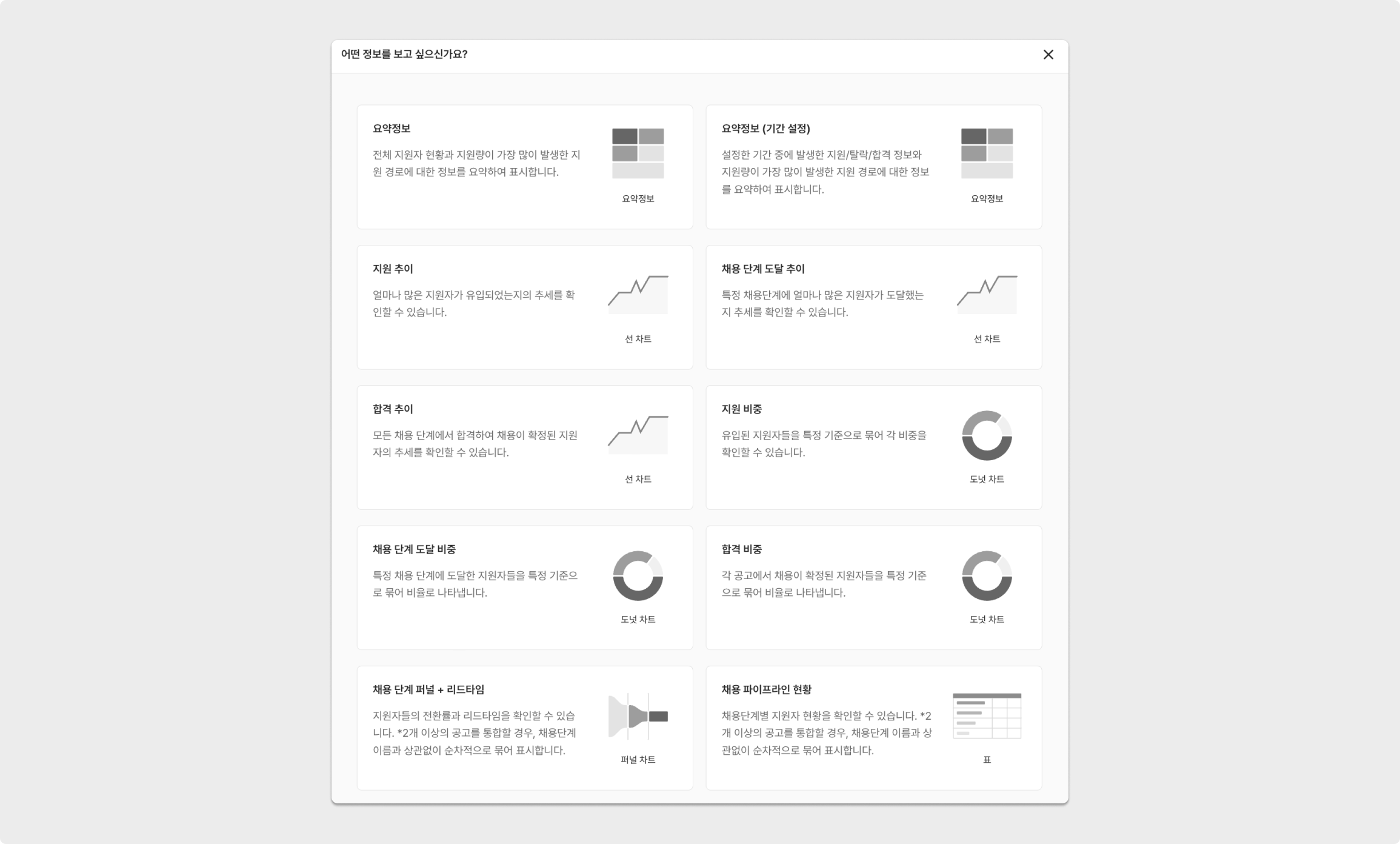 '요약정보'를 제외한 각 차트 모듈은 차트 이름/채용 단계/모아보기/필터 등의 다양한 옵션 설정이 가능합니다.
