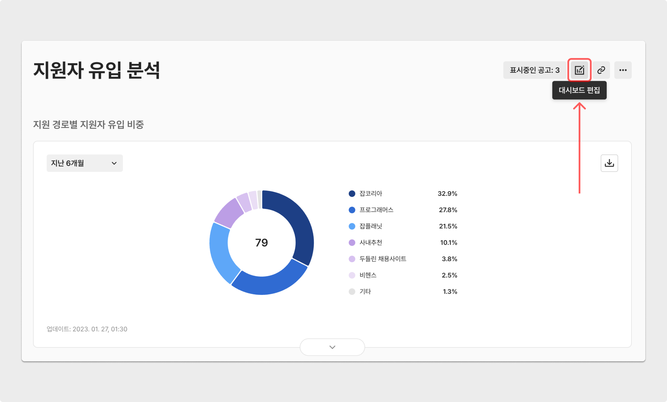 대시보드 우측 상단의 [대시보드 편집] 버튼을 눌러주세요. 이후의 편집 과정은 새로운 대시보드를 만드는 과정과 동일합니다.