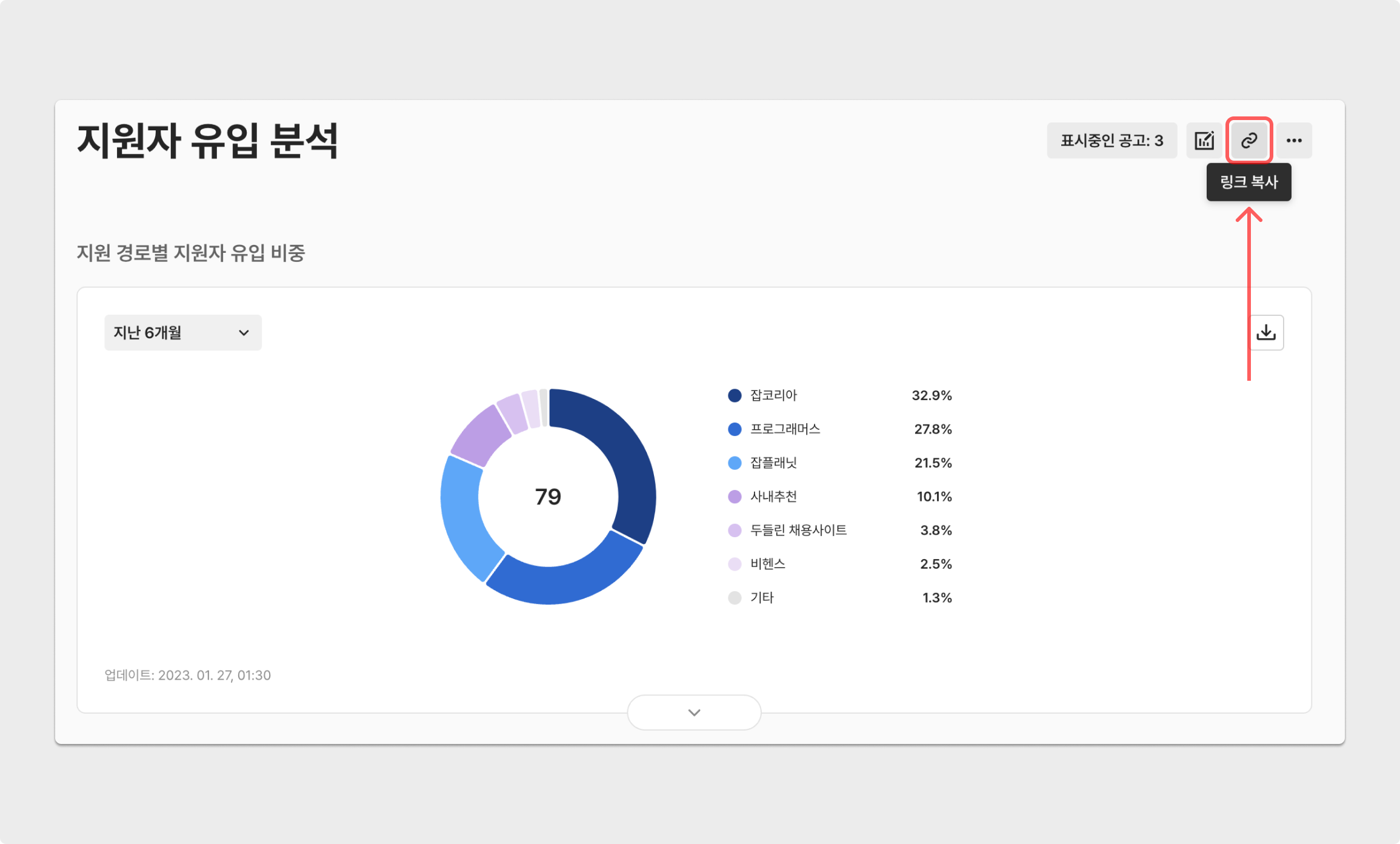 직접 만든 대시보드를 팀원들에게 공유하고 싶다면, 우측 상단의 [링크 복사] 버튼을 클릭한 후 메신저나 이메일 등에 첨부해 보세요.