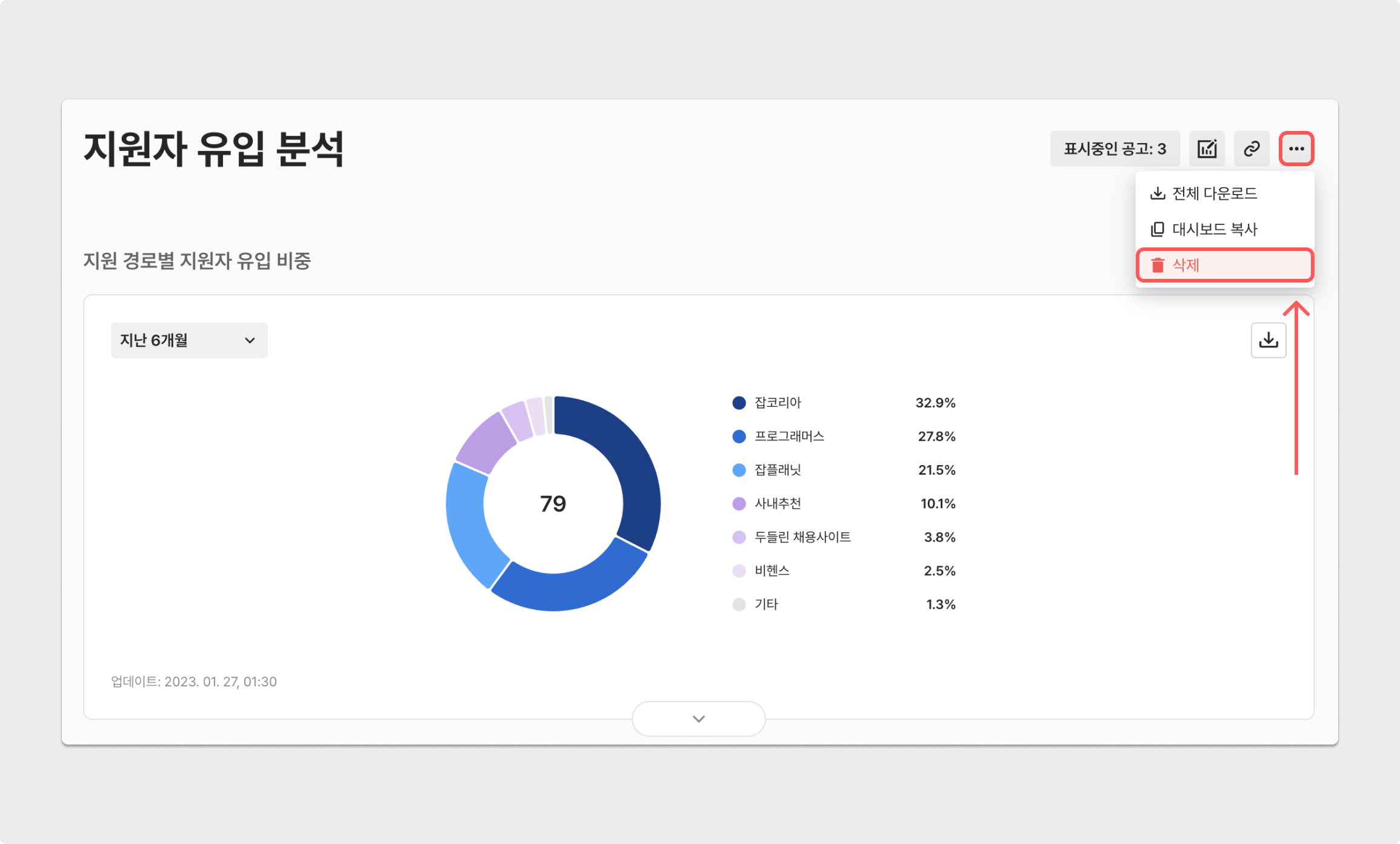 우측 상단의 [더보기] → [삭제] 버튼을 통해 대시보드를 삭제할 수 있습니다.