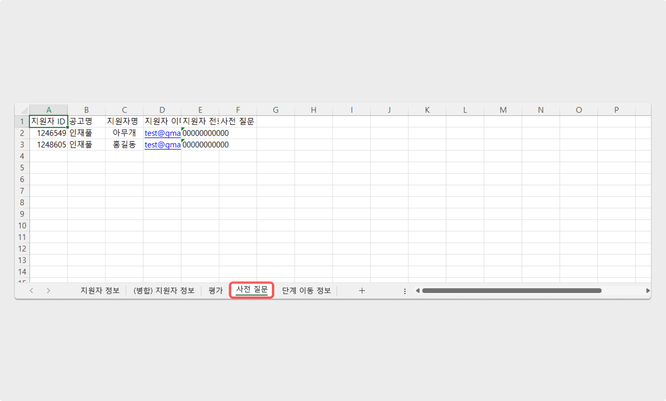 지원할 당시의 사전 질문과 그 답변을 확인할 수 있는 [사전 질문] 워크시트입니다.