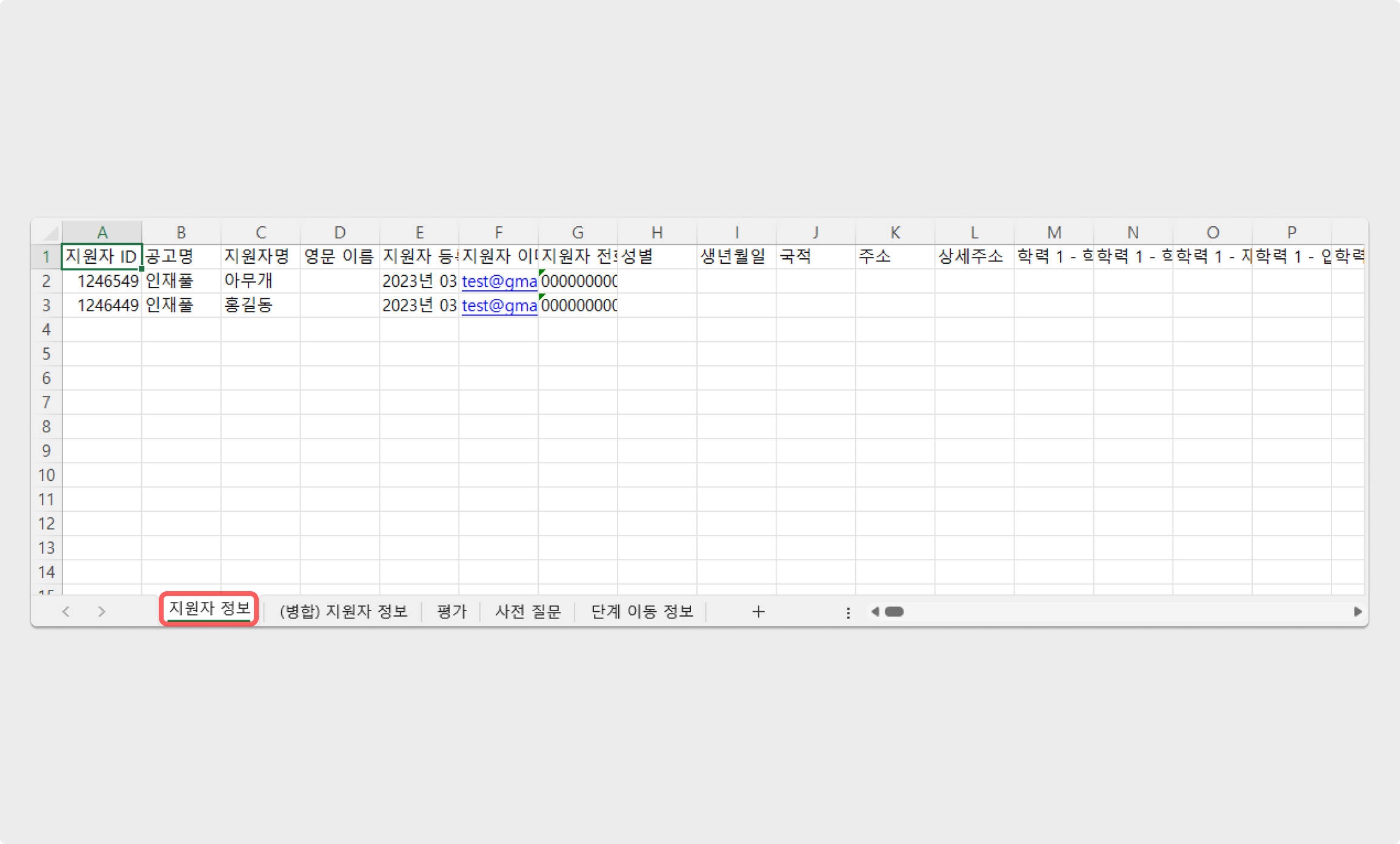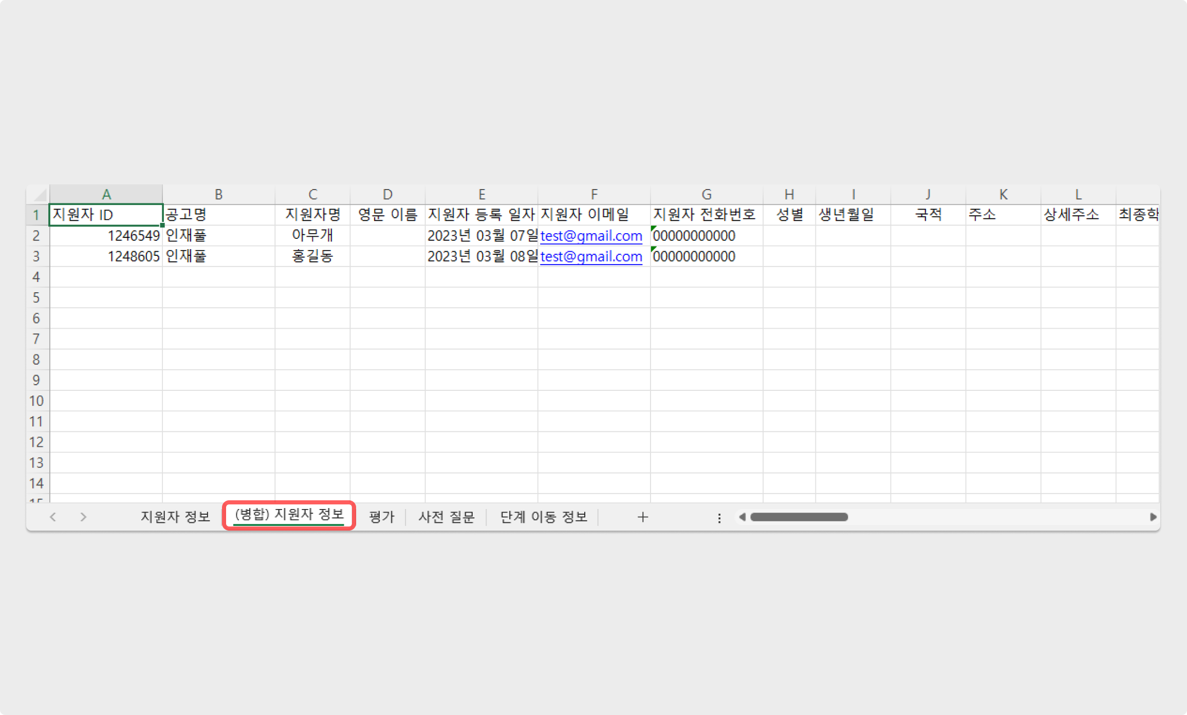 지원자명, 지원자 등록 일자, 메일 주소, 전화번호, 태그 등의 기본 정보를 셀병합이 없이 제공하는 워크시트입니다.