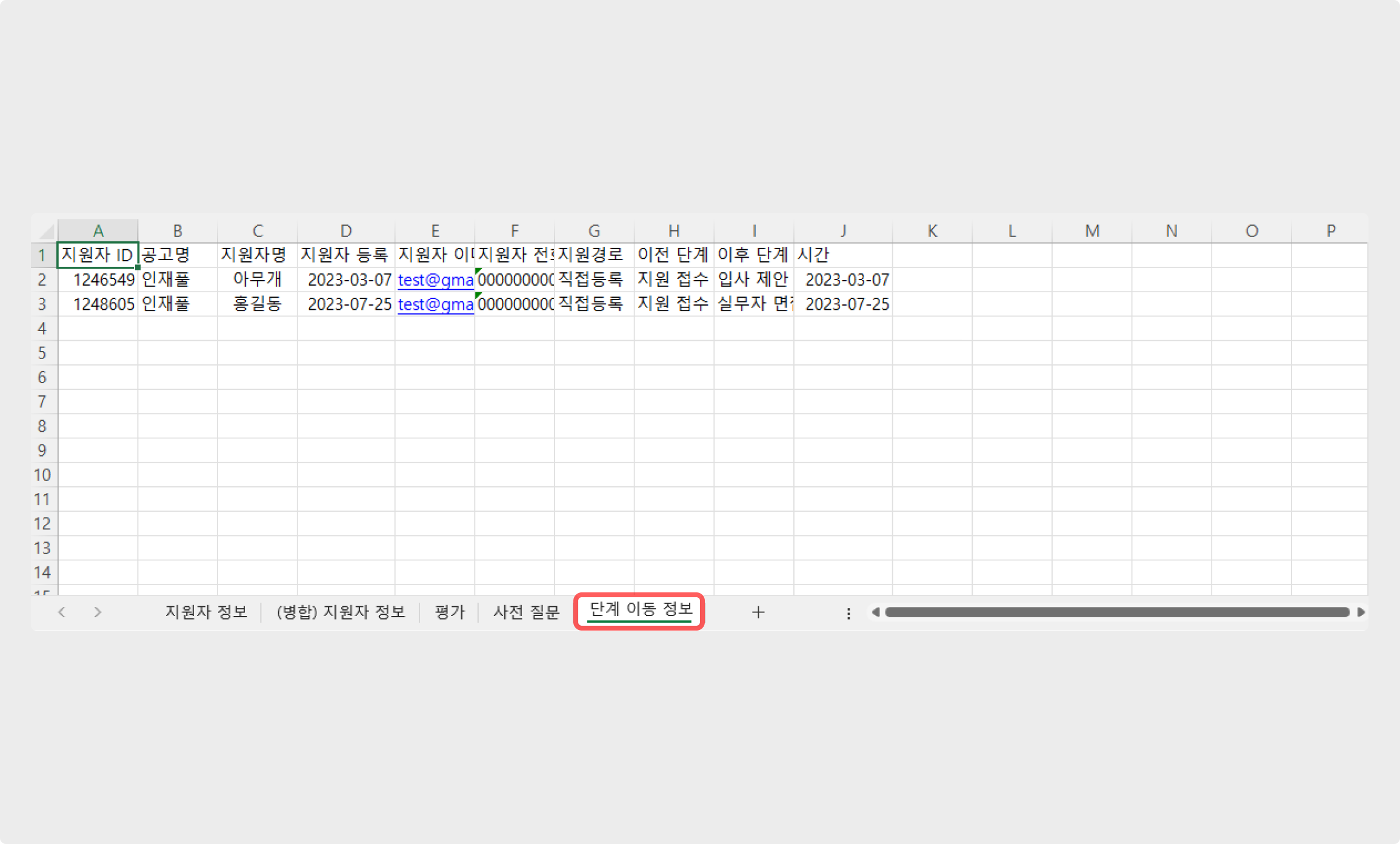 지원자 정보 엑셀 파일 - 단계 이동 정보