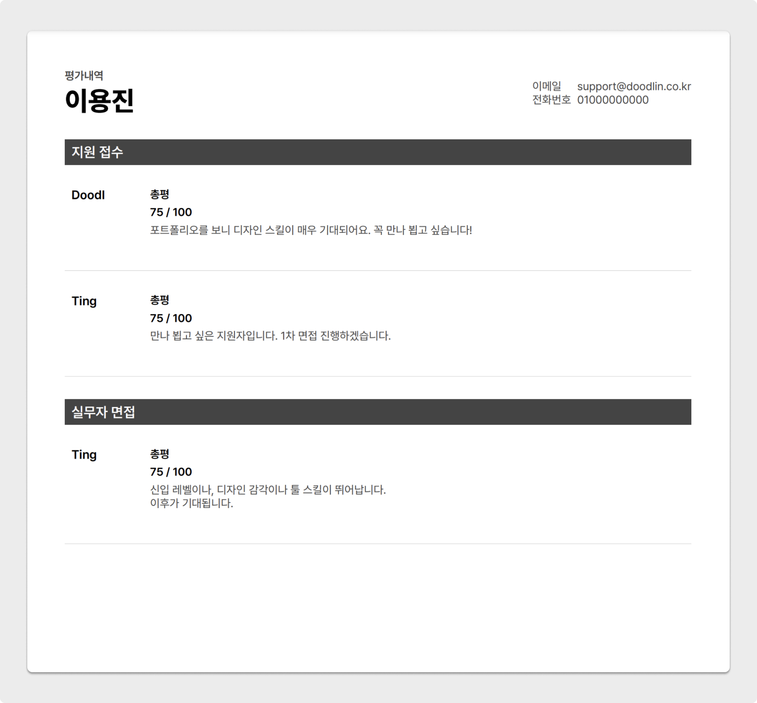 지원자 상세 페이지의 [평가내역]에 접근한 후 [평가내역 다운로드] 버튼을 통해 지원자의 모든 평가내역을 PDF 파일로 다운로드 및 출력할 수 있습니다. (business plan)