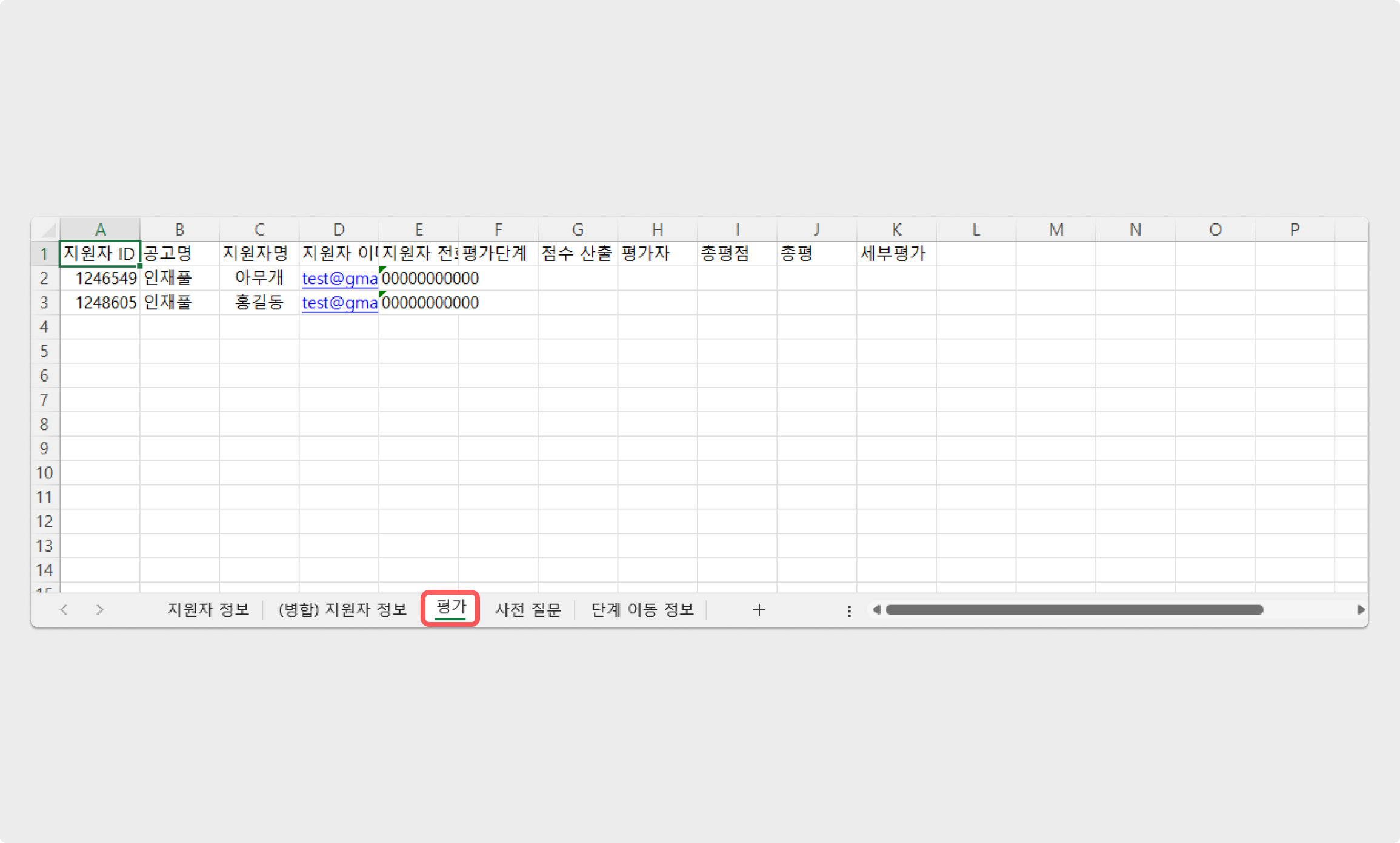 지원자의 공고명, 평가단계, 평가자, 총평 등의 평가 내역을 확인할 수 있는 [평가] 워크시트입니다.
