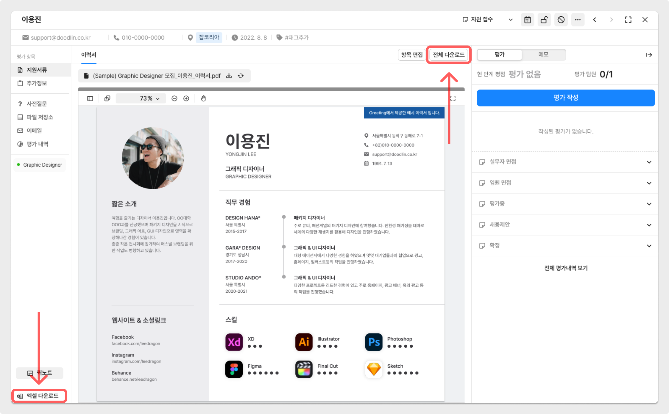 [지원자 상세 페이지] → [엑셀 다운로드]를 통해 단일 지원자의 raw data를 다운로드하거나, 중앙 상당의 [전체 다운로드]를 통해 모든 서류를 한 번에 다운로드할 수 있습니다.