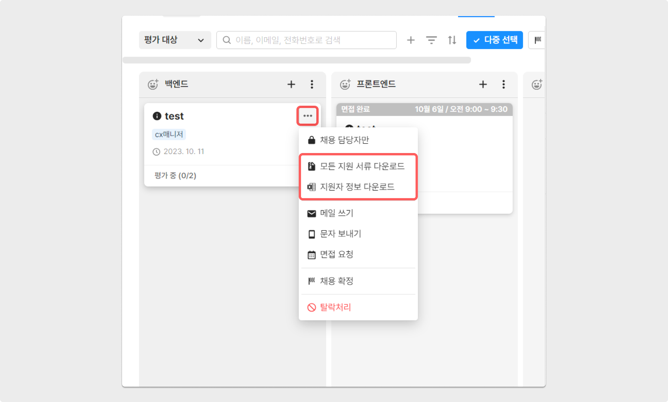 혹은, 칸반 보드 형식에서 [더보기(점 세 개 버튼)]을 클릭해 나타나는 버튼을 통해 raw data와 모든 지원 서류를 다운로드할 수 있습니다.